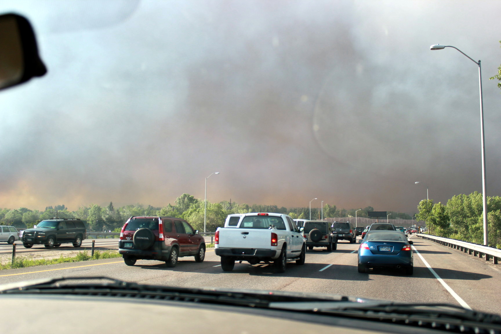 It was a rather unearthly view and traffic came to a crawl. We took Austin Bluffs Parkway, only to find out we were on the main evacuation route and we weren’t going anywhere very fast. I tried to call Levi several times, but everyone was on their cell phone and calls weren’t going through. So while we sat in traffic, I took photos.
