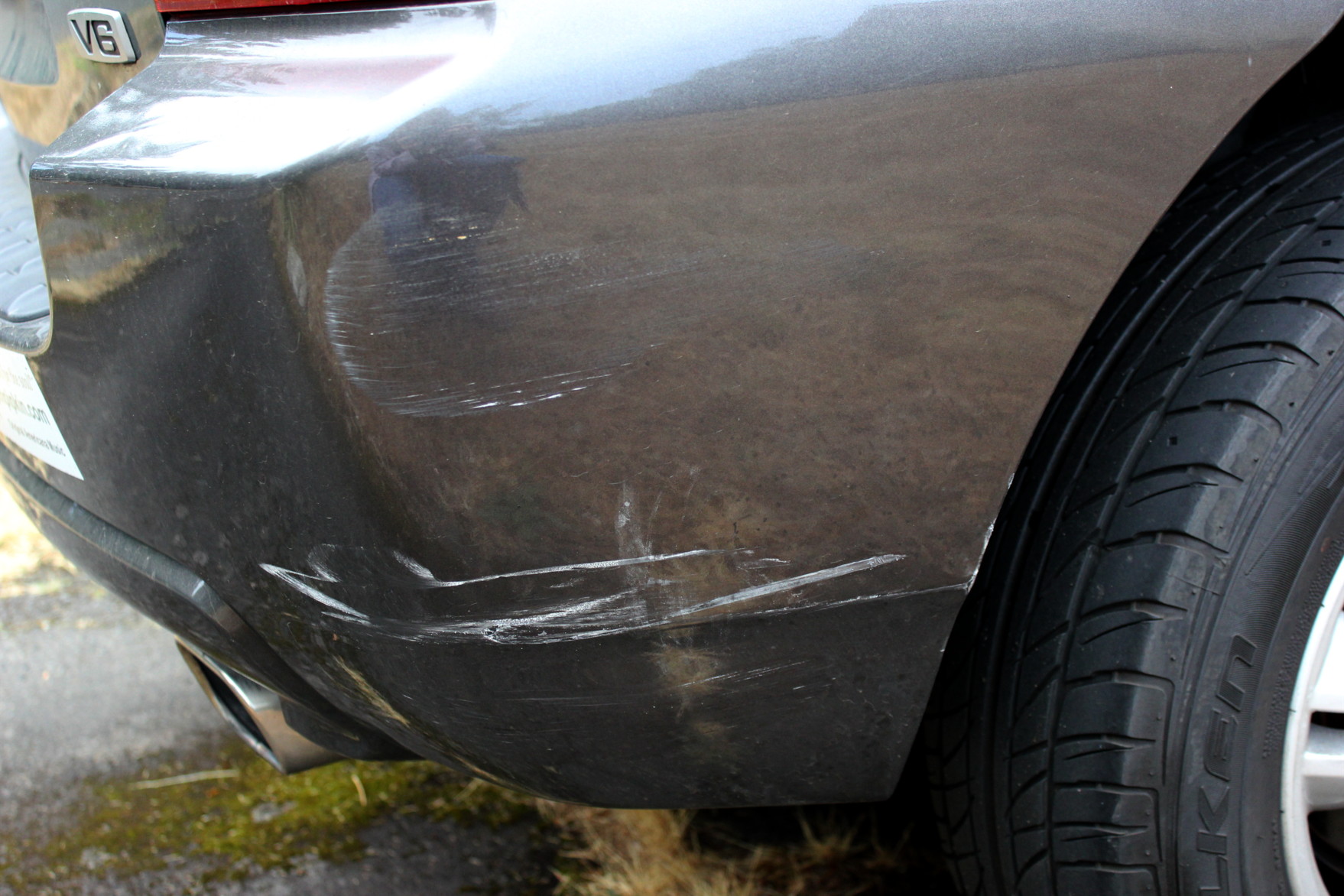 I park in the very far corner of the parking lot at work, between two large V-8 extended cab pick-up trucks. There is usually an empty space on either side of my car (which is a very small car when you park it next to big trucks). Apparently, someone parked right next to me. And apparently that person did a pretty poor job of backing out of the space. S/he hit my tire and then scraped across my bumper. The scrapes are several millimeters deep.