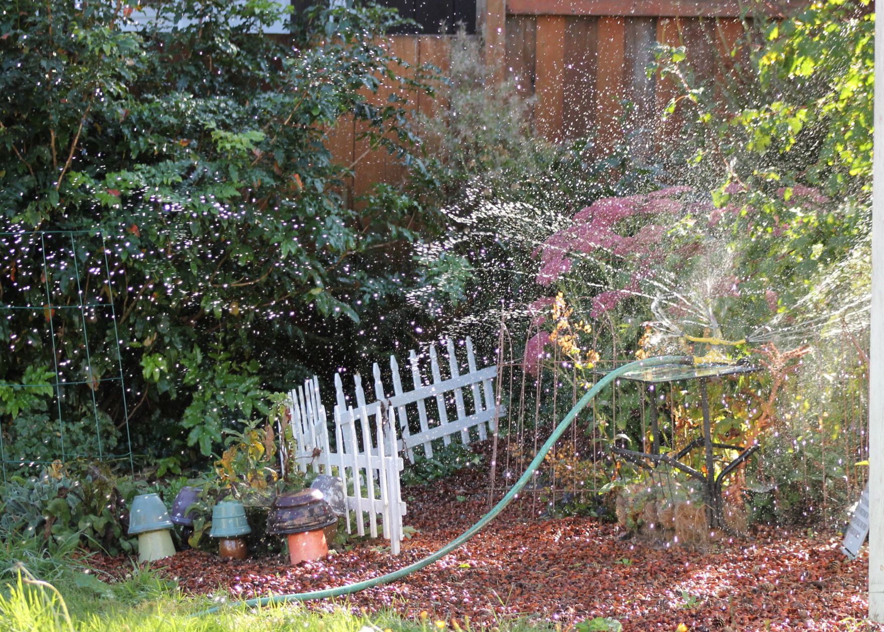 I am still watering. We have had a record dry summer here. No, we’re not (yet) in a drought, but it has been wonderfully dry and sunny with no end (yet) in sight. I have a few newly planted items that need the additional water. And a volunteer tomatoe that might actually give me eight fat, juicy tomatoes. I hope.