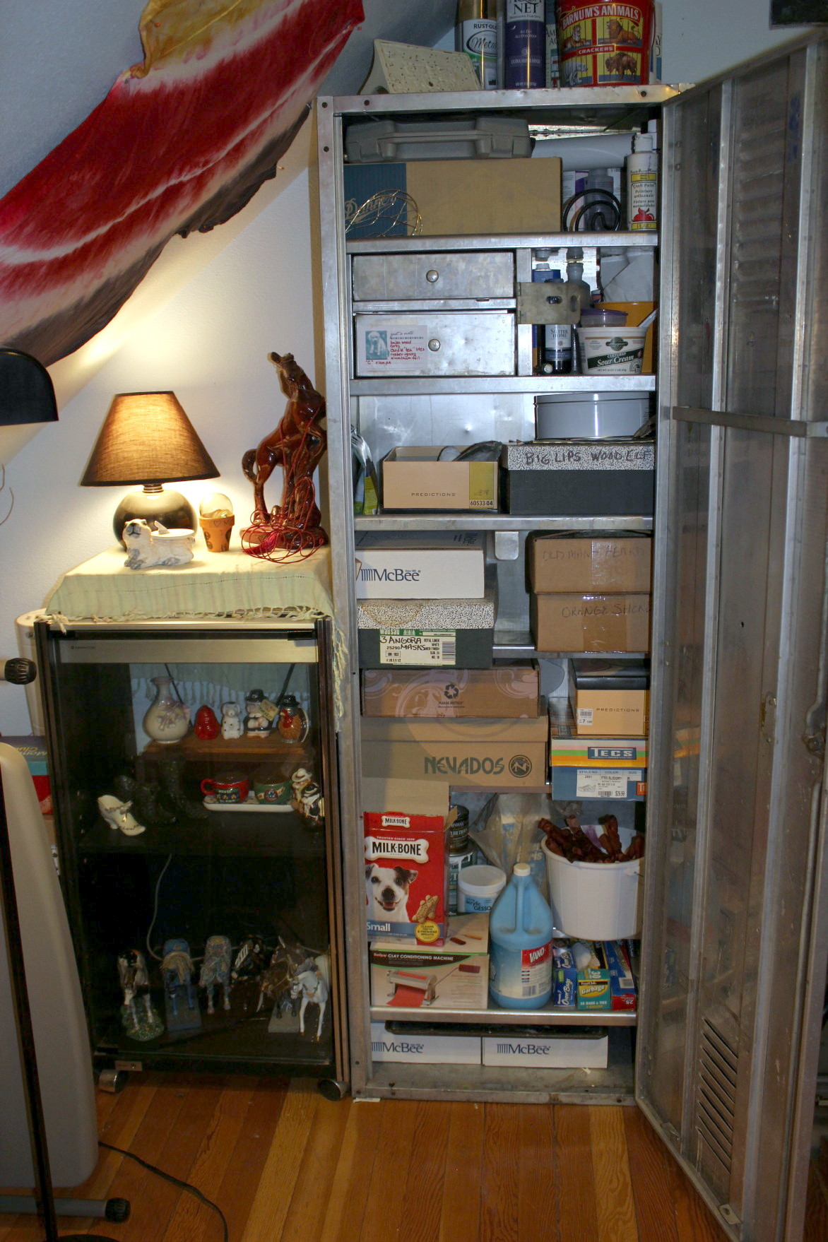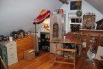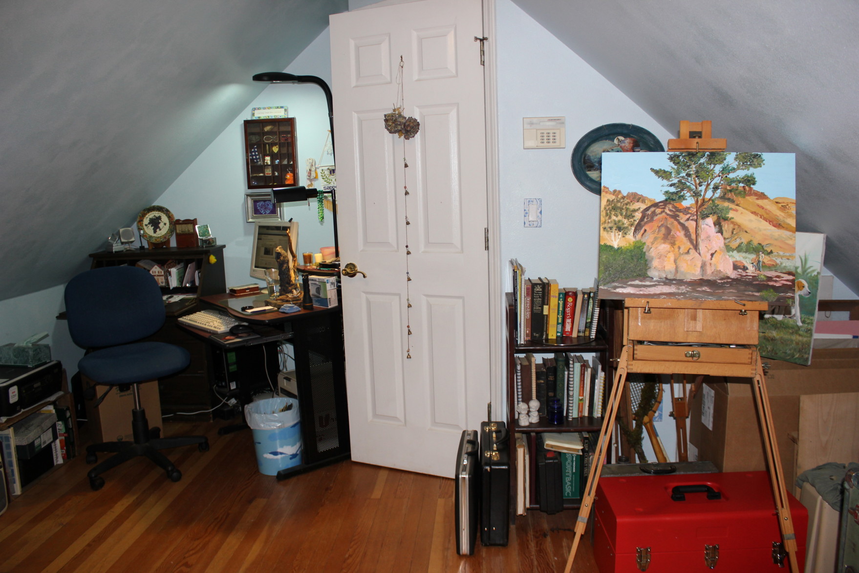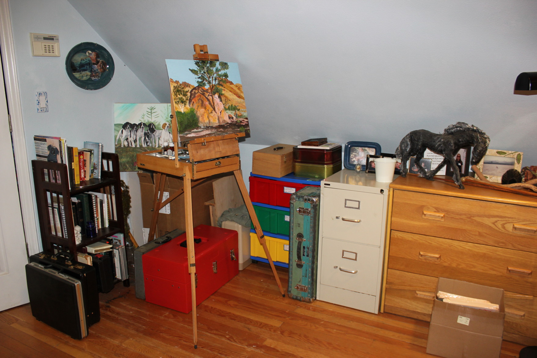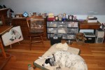 This corner is a bit of a mess. I have frames and canvases stored in the boxes that Banker’s Boxes come in. I can’t think of a neat way to store the over-sized stuff. But I did think to prop an old oil painting up on them, to sort of take away from the ugliness of the cardboard, and the crowd of tool boxes. The painting is of Don’s last dog (before Murphy): Rejoys Hannah’s Promise, better known as Sadie. She was the brown-and-white English Pointer in the center of the litter. Dumbest Dog that ever lived and I miss her so! We had her for 10 years before cancer claimed her.