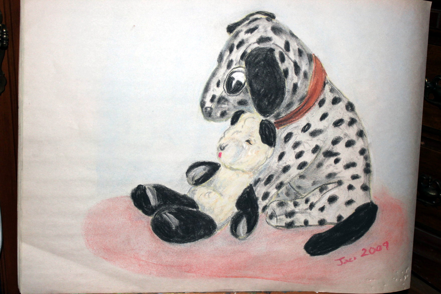 So I picked this silly pastel portrait of Lucky Dog and Teddy Bear, life-long friends. They’re actually inside a box somewhere in my attic. Lucky Dog was a promo stuffed animal for the very first release of the original Disney Movie, “101 Dalmatians”. I lost Lucky Dog for an entire year once. Then someone (I think my brother) found him in a vacant lot a couple blocks from our house, just a little worse for wear. We’ll never know what adventures he went on for that year, but I was so very happy to have him home again! And when I was 15, my mom very carefully resewed his body with new spotted faux fur. His stuffing and eyes are original.