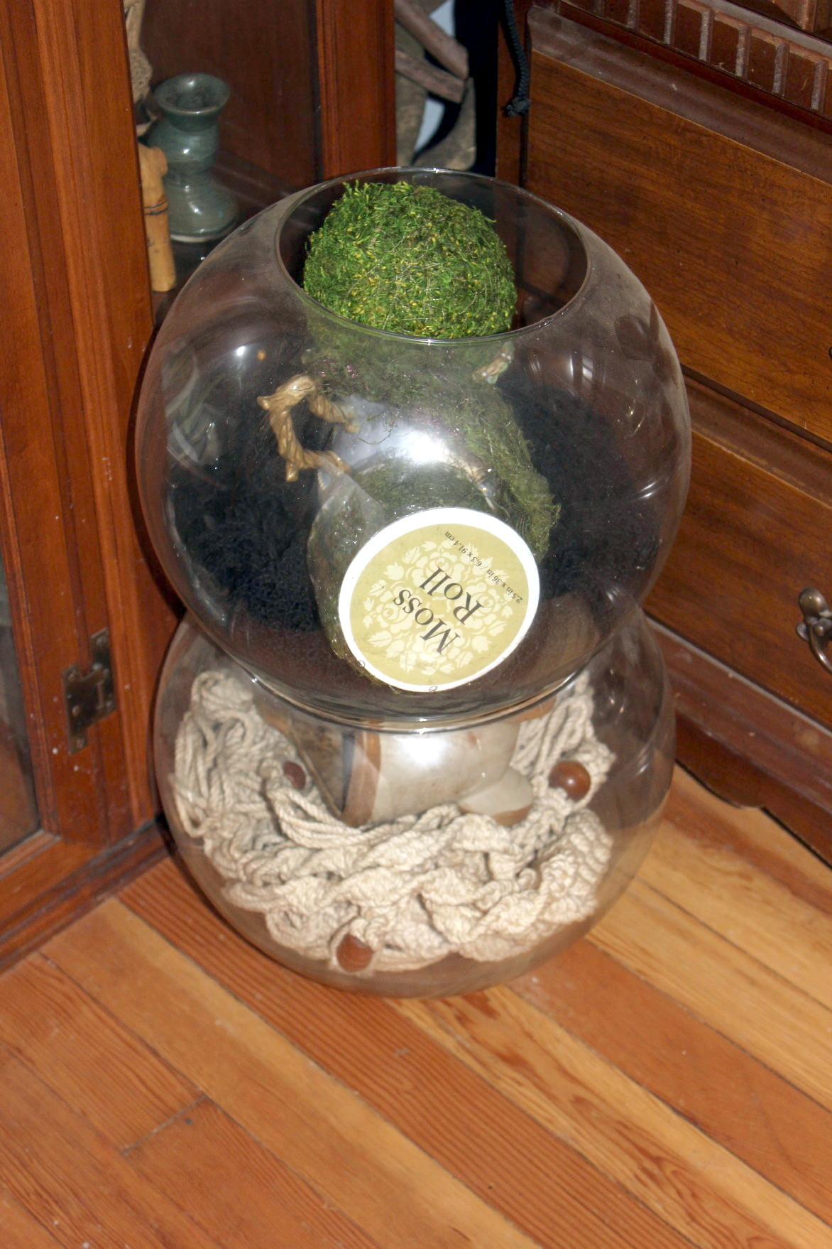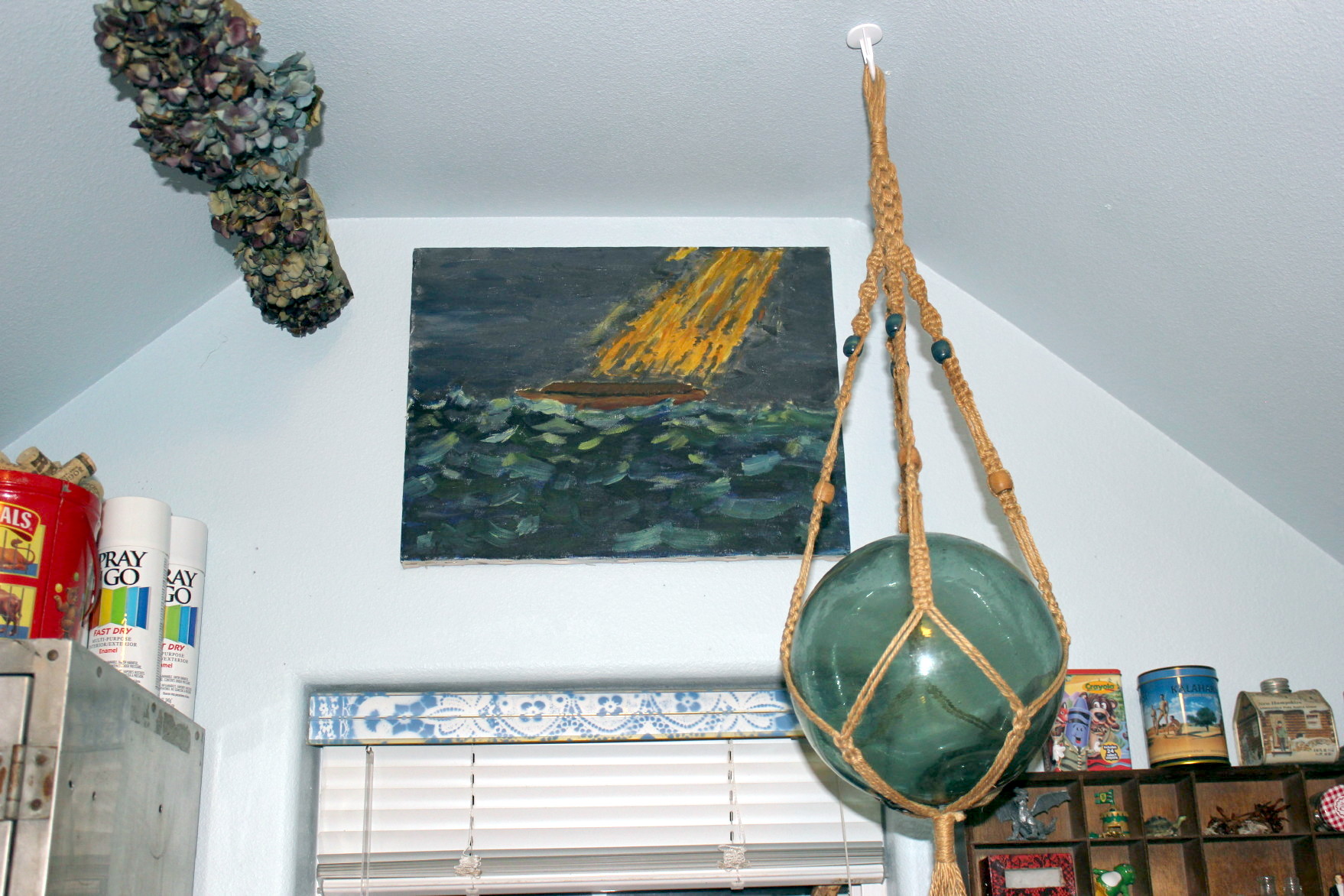 Levi painted the flower pot that holds the tiny glass float. I no longer remember where I picked up the tiny float, but it’s a genuine Japanese float.