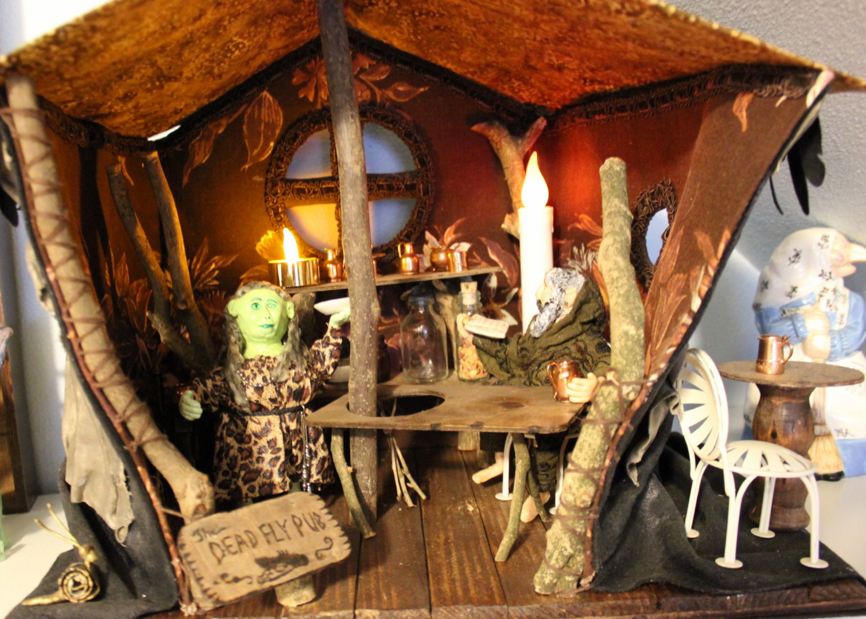 The Dead Fly Pub was my first Faerie house. I can’t bear to part with it. Mavis is the Goblin waitress and Petrick is a regular. Baba Yaga in the background has nothing to do with the Dead Fly Pub, but she doesn’t clash.