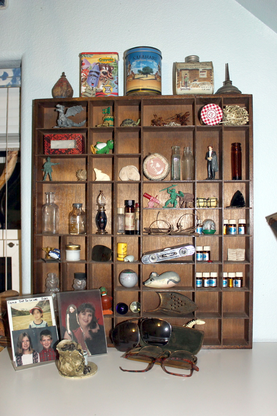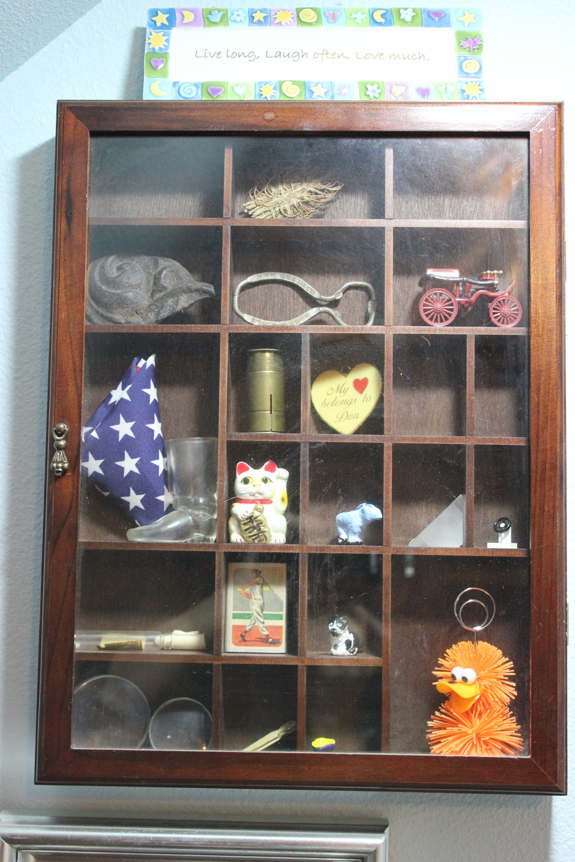 This is my other shadow box. My friend, Audrey gave it to me. I still have empty slots to fill. My dad’s flag and my mom’s glass boot, a “good luck” cat (also from Audrey), some miniatures in polymer clay that I made and painted, a broken piece from an old cast iron wood stove, and the list goes on.