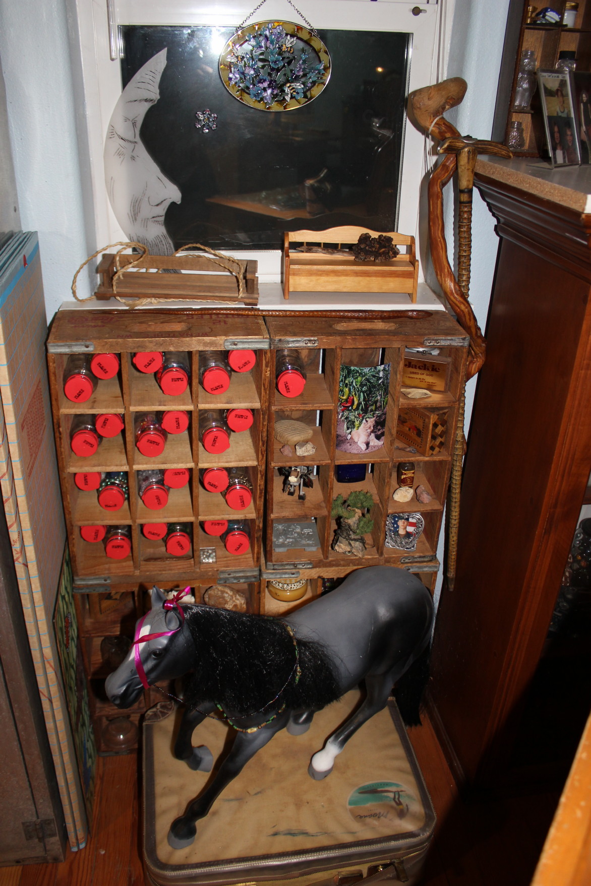 Did I mention I like shadow boxes? I have a collection of old Pepsi crates that I have used as shadow boxes. Now they do duty as storage for the many jars of beads and buttons that I use. The Man-in-the-Moon is a fragment of fiberglass that I found up in the woods where some contractor just dumped his trash. I hate the contractor for his dump, but I salvaged that little fragment because of the shape. I etched the Man-in-the-Moon into it. The canes came from my great-grandfather’s estate.