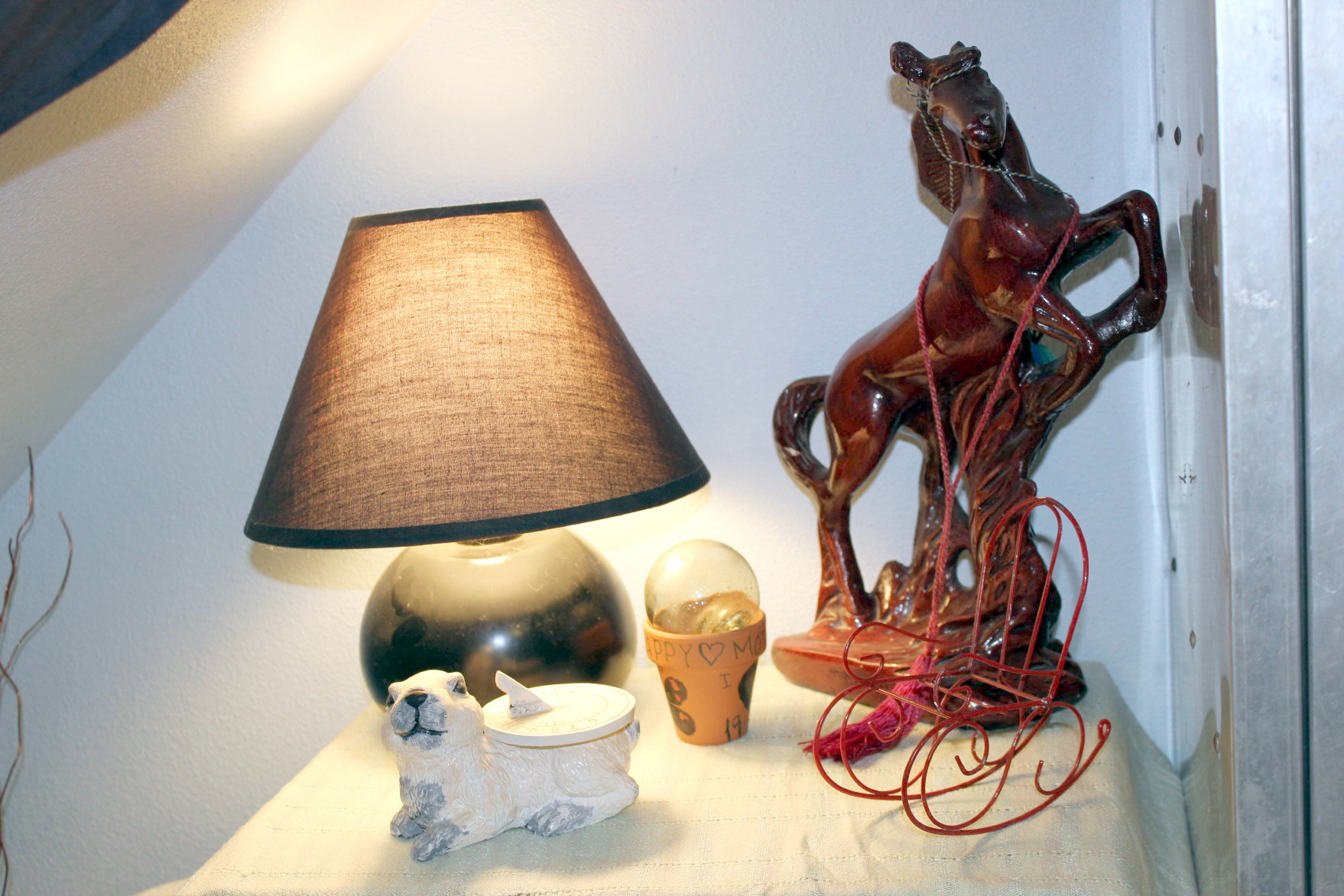 The horse on the top of it was a gift from a neighbor girl many, many years ago. She was younger than both of my children. We all lived in a little trailer park and I had a horse in the pasture next to us. When the little girl’s parents bought a house in town and they moved away, she brought me this prized possession of hers as a “thank-you” for the few times that I gave her a ride on my horse. I truly treasure that horse.