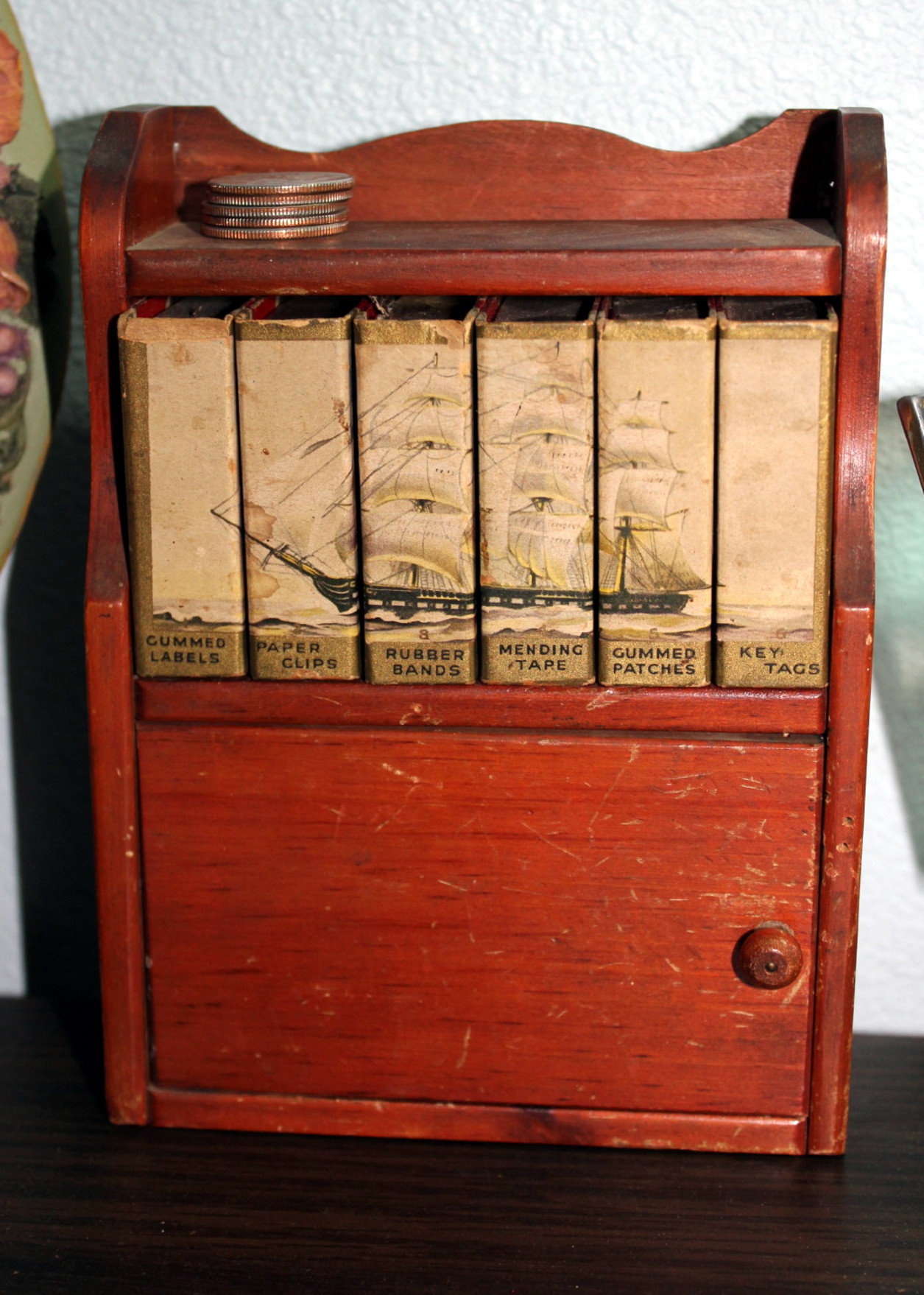 I have to share this. It’s just so cool! I’ve had it for 3 decades. The little boxes are the size of matchboxes and they hold such office “essentials” as: gummed labels, paper clips, rubber bands, mending tape, gummed patches, and key tags. Tell me that isn’t the coolest (and most useless) thing! I can’t bear to part with it because it is just so fun.
