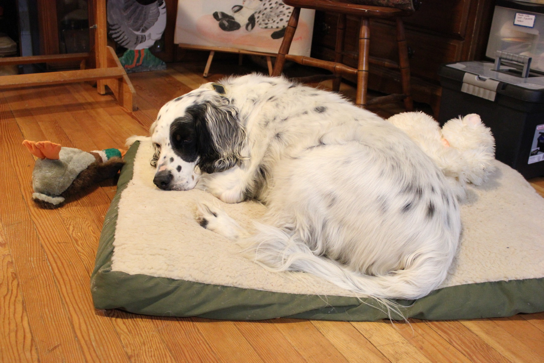 My assistant. I put his bed out in the loft while I worked and he still came and laid down in the middle of the floor while I worked. He was quite happy when I finally moved his bed back into the studio.