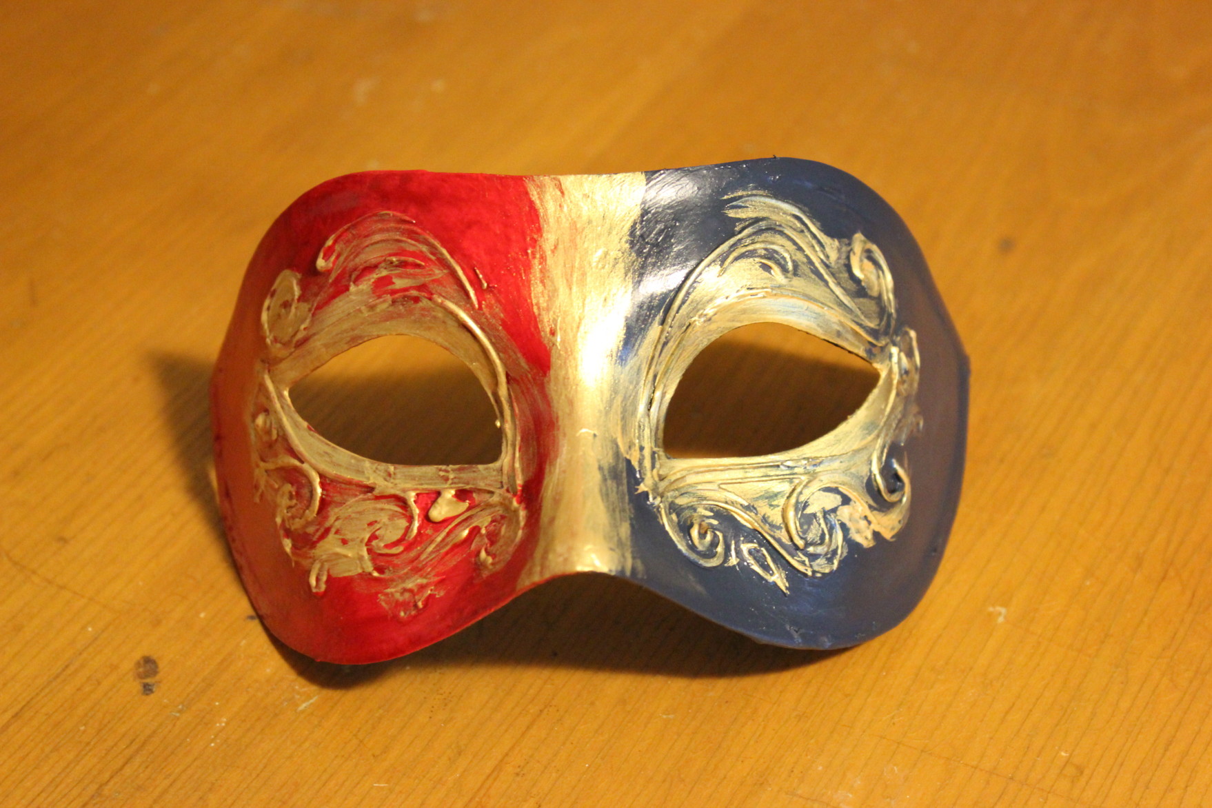 And for the heck of it: my current project. I picked up this mask for $0.25 at Goodwill. The gilding had been knocked off as had some of the raised design. I used some “golden” and reapplied the design, and then I painted it. I still have to glue on the rick-rack and ribbon. I’m very pleased with how it is turning out.