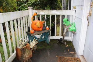 From left-to-right: I picked up the hands at Goodwill last year. Awesome. A rat begs beside the Cannibal jack o’lantern. Jake & Elwood (the Alien twins) decided to come outside this year. And I got a glow-in-the-dark skeleton for the doorbell hanger. That weird little candle stick holder up above the Alien twins was a yard sale find. I think it was someone’s high school pottery project gone wrong. Oh – and there’s a red-eyed rat down on the old root. (You have to click on the photo to see everything close up).