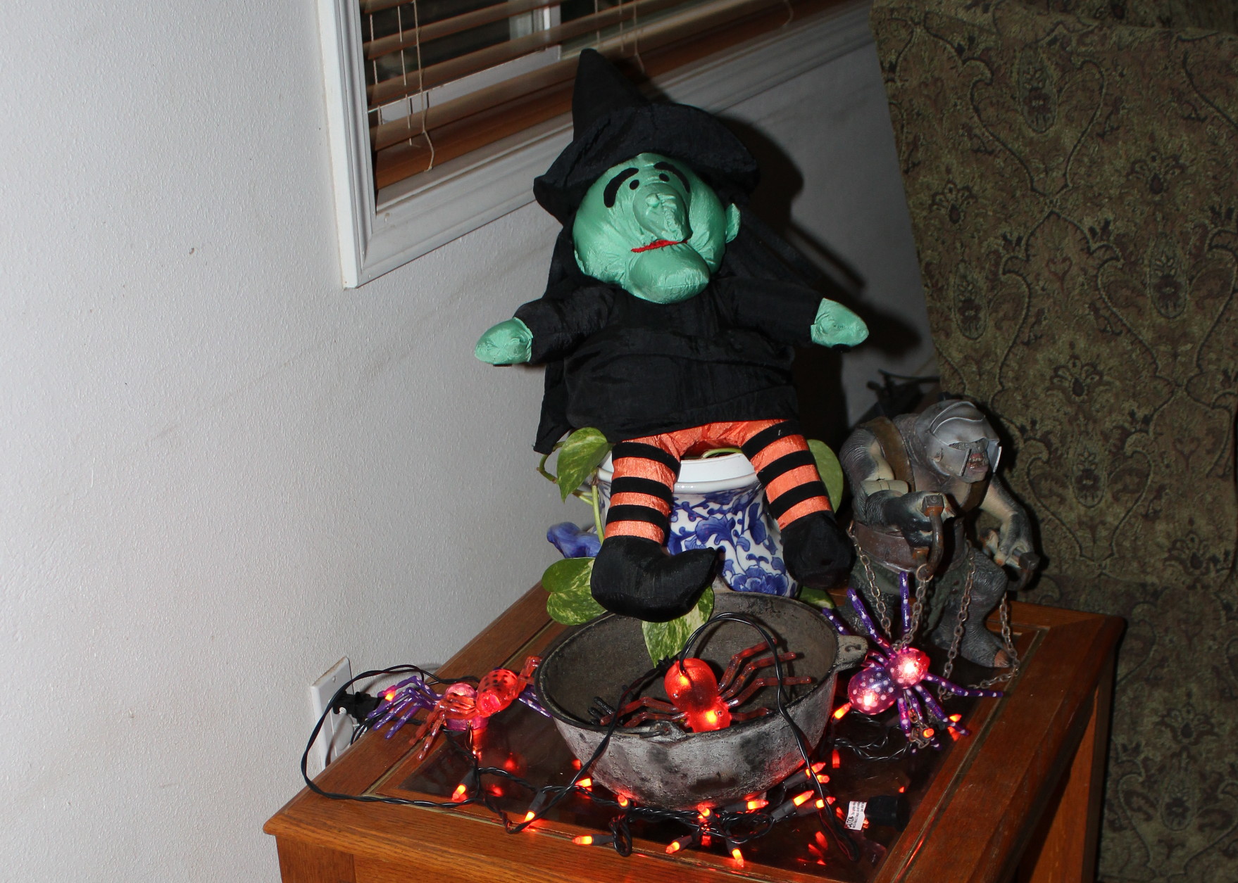 Time has brought changes and I now openly celebrate Hallowe’en. I gave up on trying to fit my round self into the square hole of conformity. This decision has brought a little freedom into my world: I openly dress up on October 31st and I have a small collection of items that go on display to entice little Trick-or-Treaters to come to our front door for candy. I add a little bit every year.