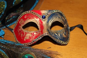Since I am on the subject of dress up, I found this mask at Goodwill. It was chipped and faded and beat up. I stripped the ribbon off of it and cleaned it up. I used some “Golden” that is in my bag of tricks and recreated the raised filigree design. I mixed some paint and repainted it, regilded it, and then I heated up the hot glue gun and replaced the ribbon and the “jewel”.