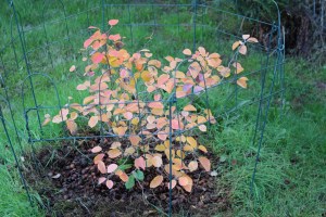I wanted to weed the grass back from my Fothergilla Major Blue Shadow. It is supposed to be a showy plant through three seasons: when it flowers, after it flowers with it’s blue leaves, and in the Autumn when the leaves turn bright red. Hm. Not quite bright red, but it is pretty.