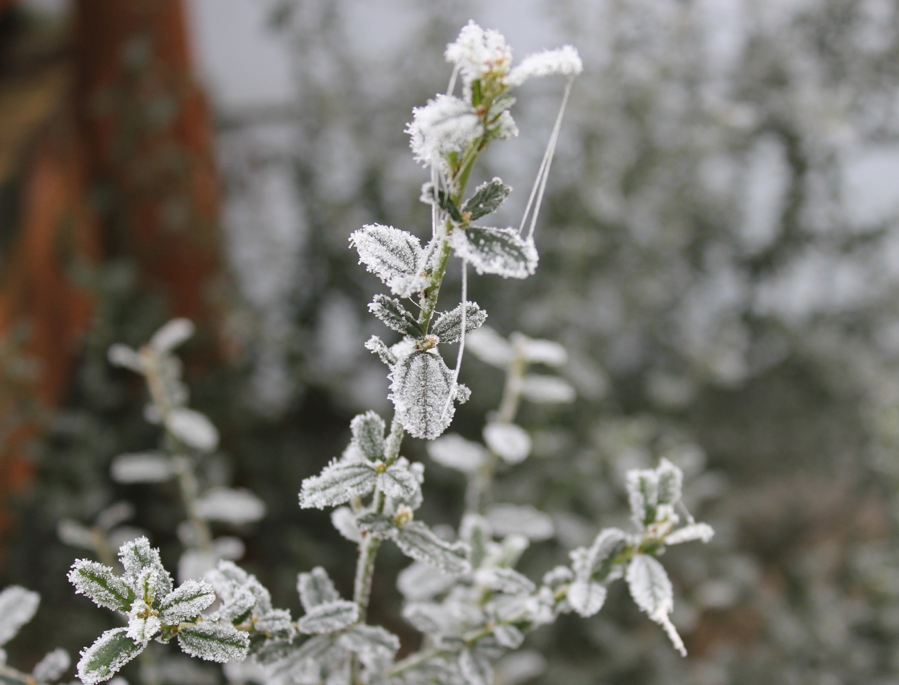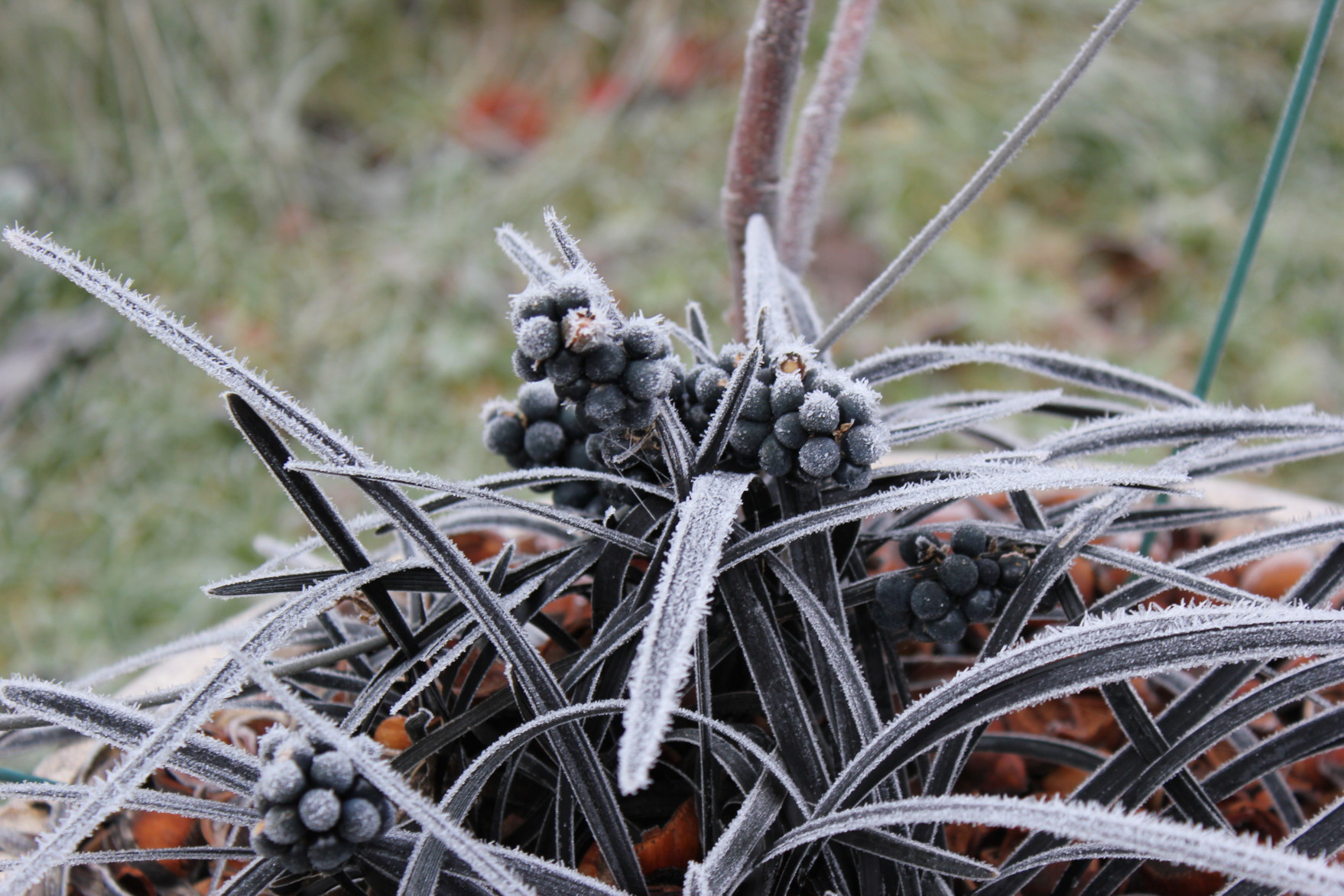 For me, the freeze is a chance to run around the yard and hunt for the perfect snapshot of frost-laced Something. Like the Oregon Grape with its red stems.