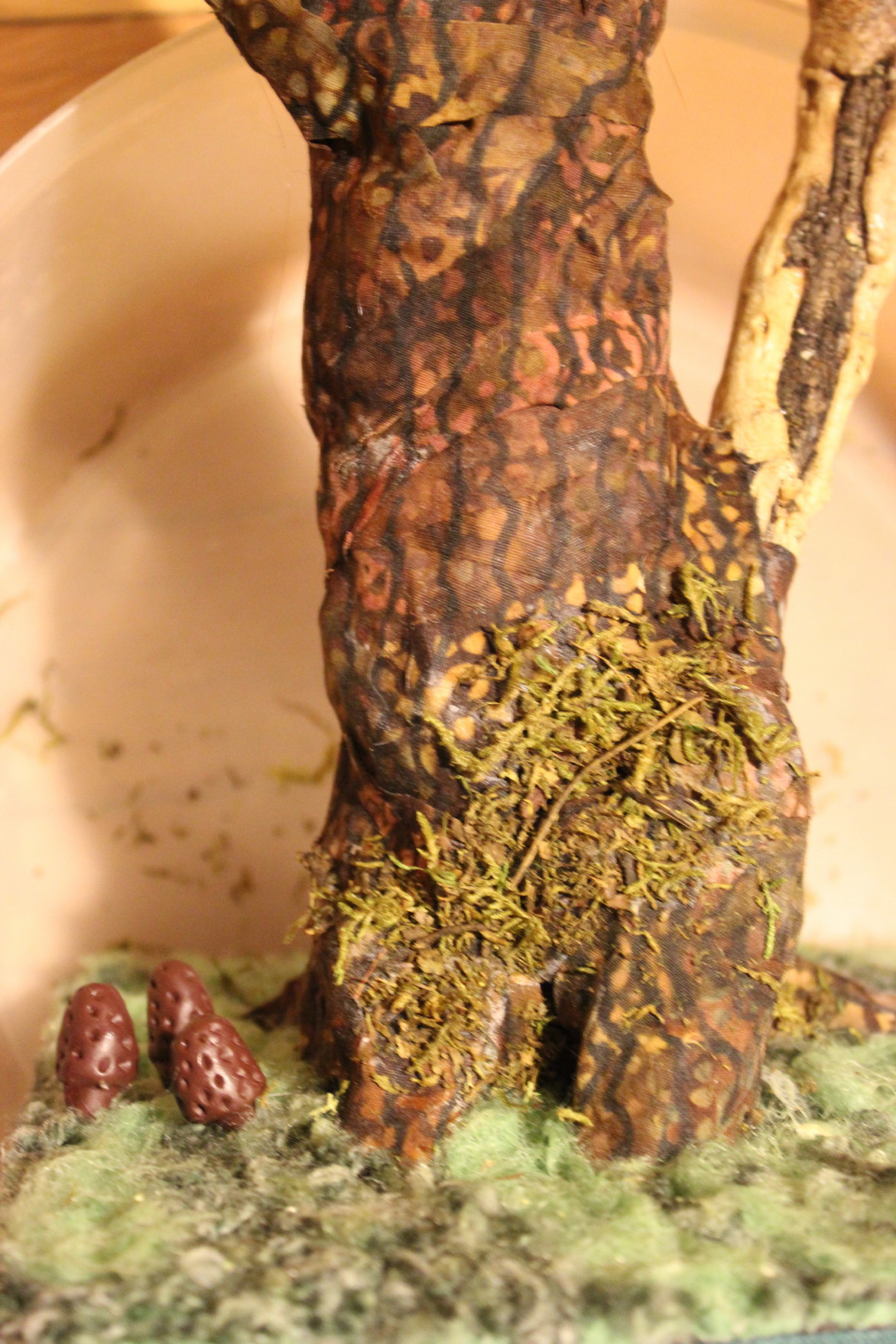 I used it to glue the yarn down on the base of the tree, to glue the tiny Morel Mushrooms to the yarn, and to glue the moss onto the side of the tree. I have more moss to attach and am waiting for the glue to dry.
