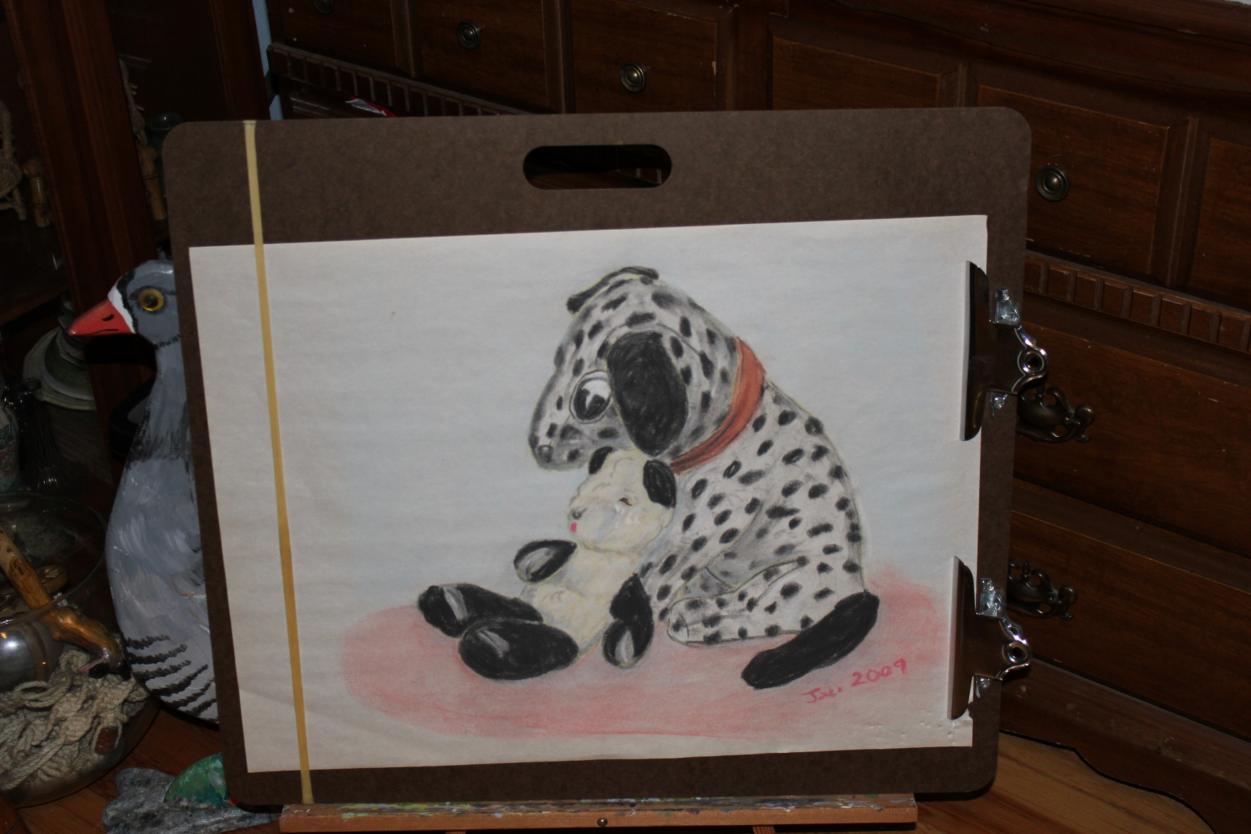 (aside: the sketch is of my two best friends from my childhood, Teddy Bear and Lucky Dog. Daphne the Goose – also a Goodwill find from long ago – is peeking out from behind.)