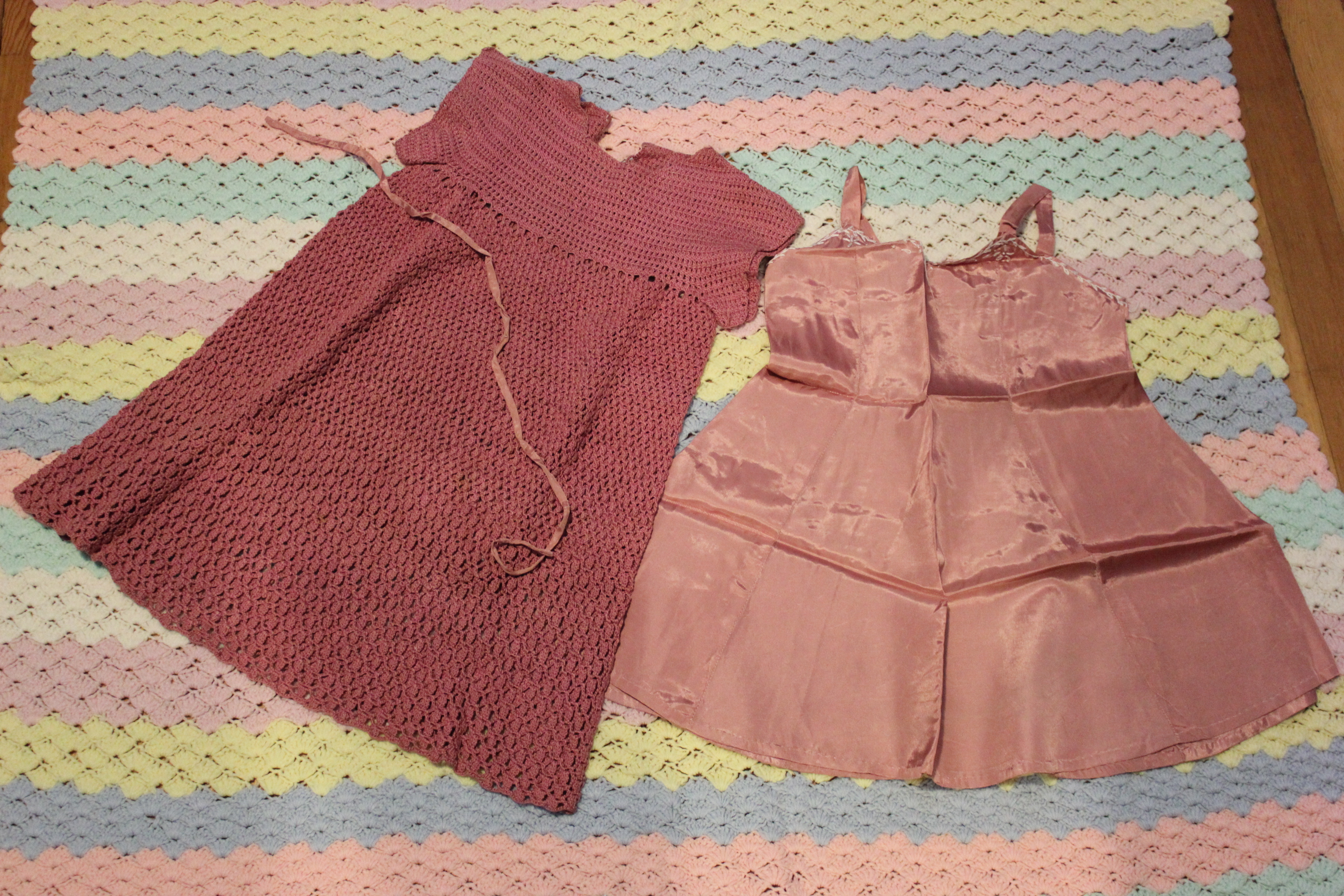 And finally – the Dress. there are actually two ribbons that are for making little bows at the waist of the crochet over-dress. The hand-made slip is satin.