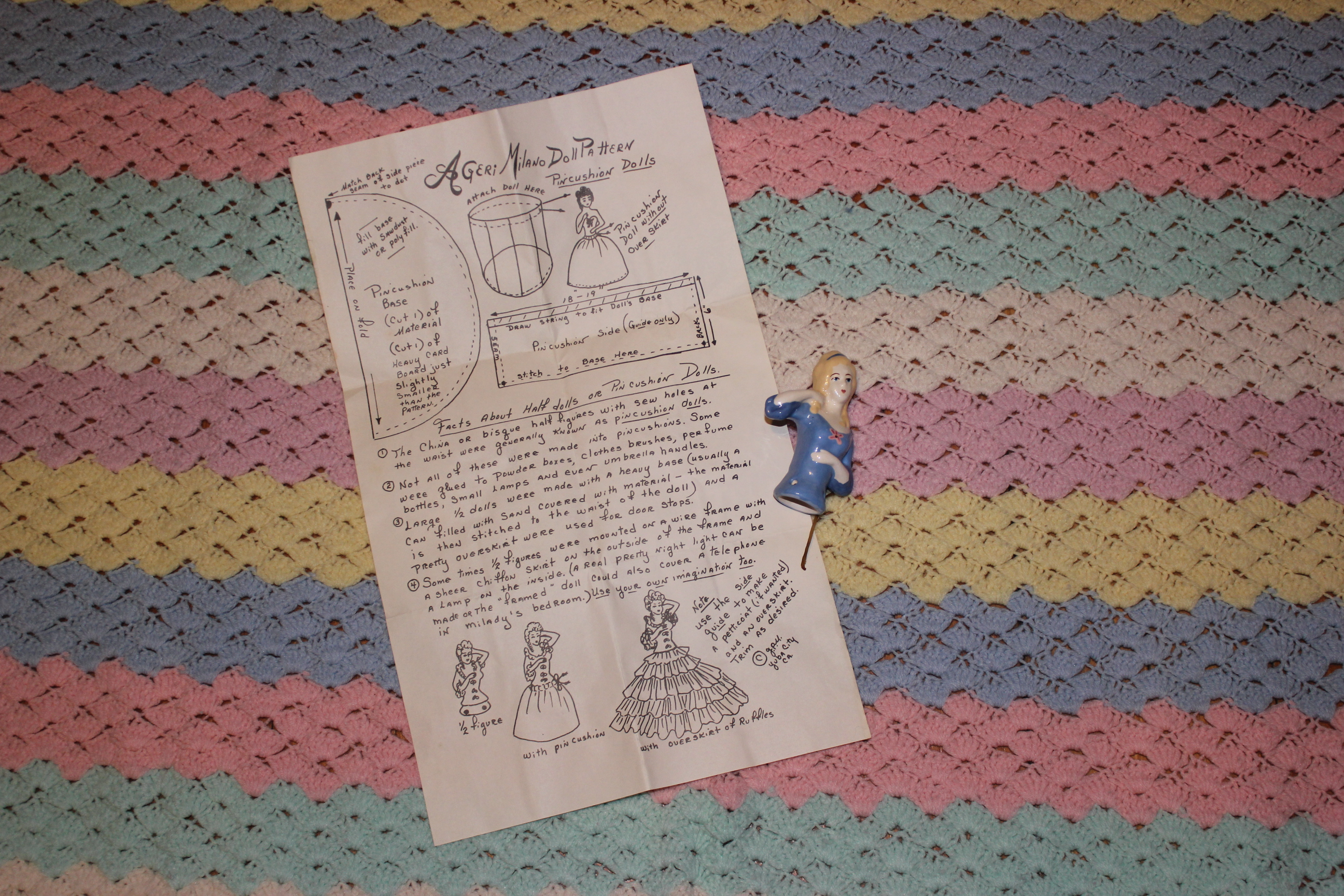 The Pin Cushion Doll has nothing to do with baby girls, but it was in the box, with the beaded girl’s slipper. There’s only one slipper and it looks incredibly miserable to wear (real beads on the instep? Ow). Pin Cushion Doll comes with instructions on how to make a pin cushion dress. Or Tea Cozy. Or telephone cover.