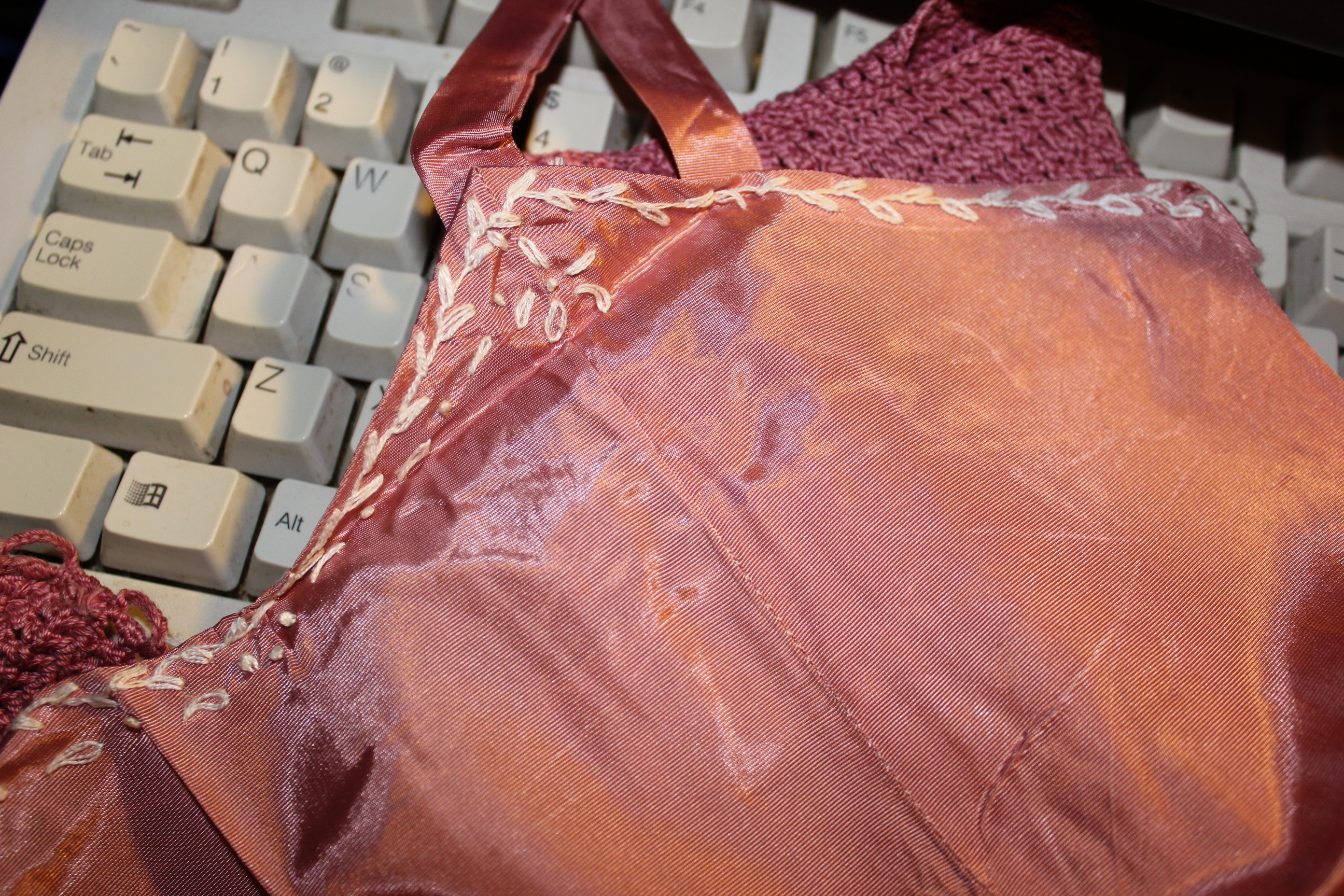The embroidery on the slip is also hastily done and serves to hold the facing down (or lack of facing, as the case is). the embroidery is all that holds the straps on. I do not know why this part was done by hand when the rest of the slip is machine sewn. Perhaps my grandmother had to finish it in a hurry and so skipped steps.