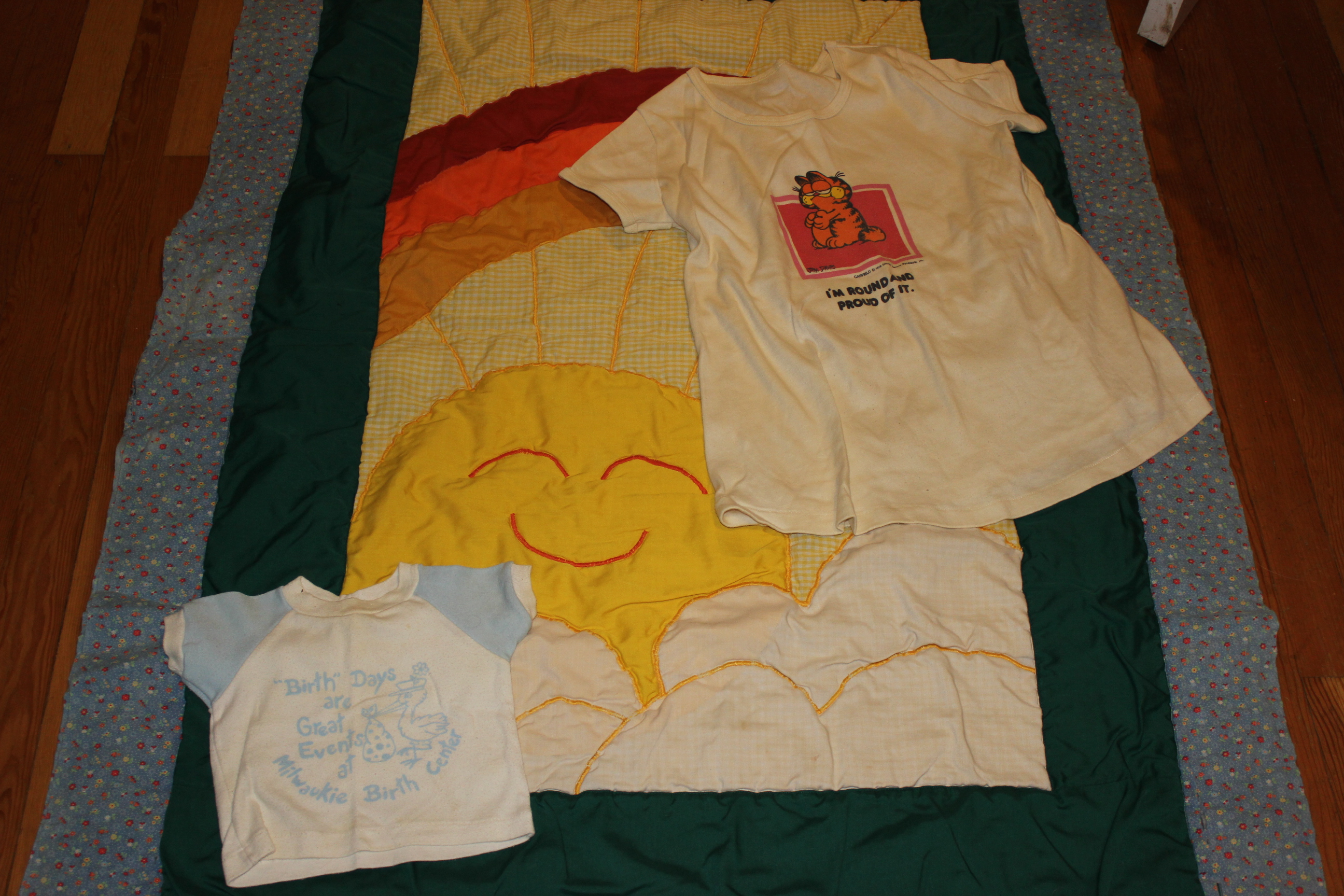 There was a well-worn, frayed baby quilt. My husband’s mother made it for Arwen. The little blue-and-white shirt was given to my son on the momentous occasion of his safe delivery at the Birth Center with the aid of two fabulous nurse-midwifes and my husband. The ugly Garfield Tee is my sentimental token: I wore it when I lost my first baby. I wore it when I gave birth to Arwen. I wore it when I gave birth to Levi. Garfield has been around (no pun intended).