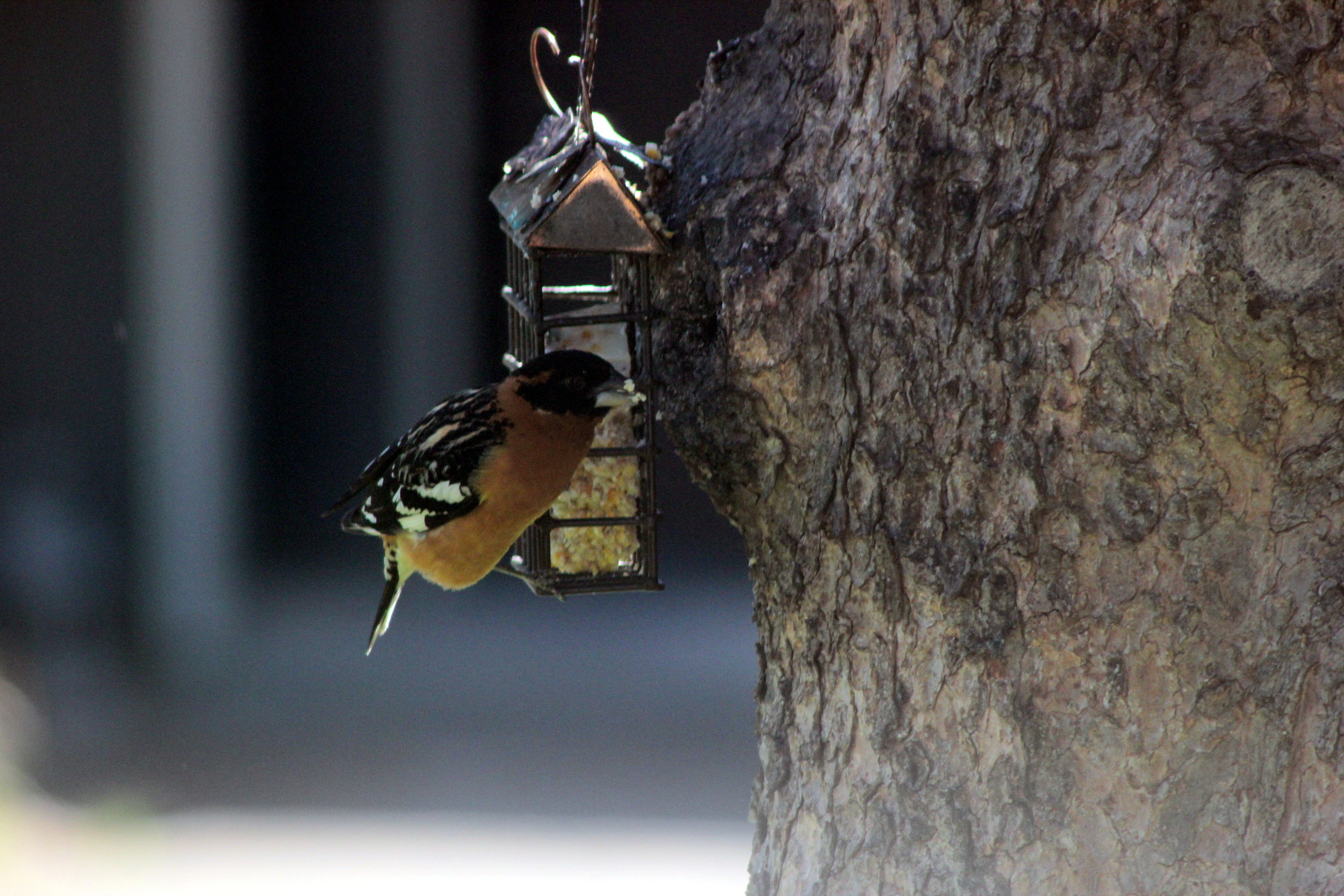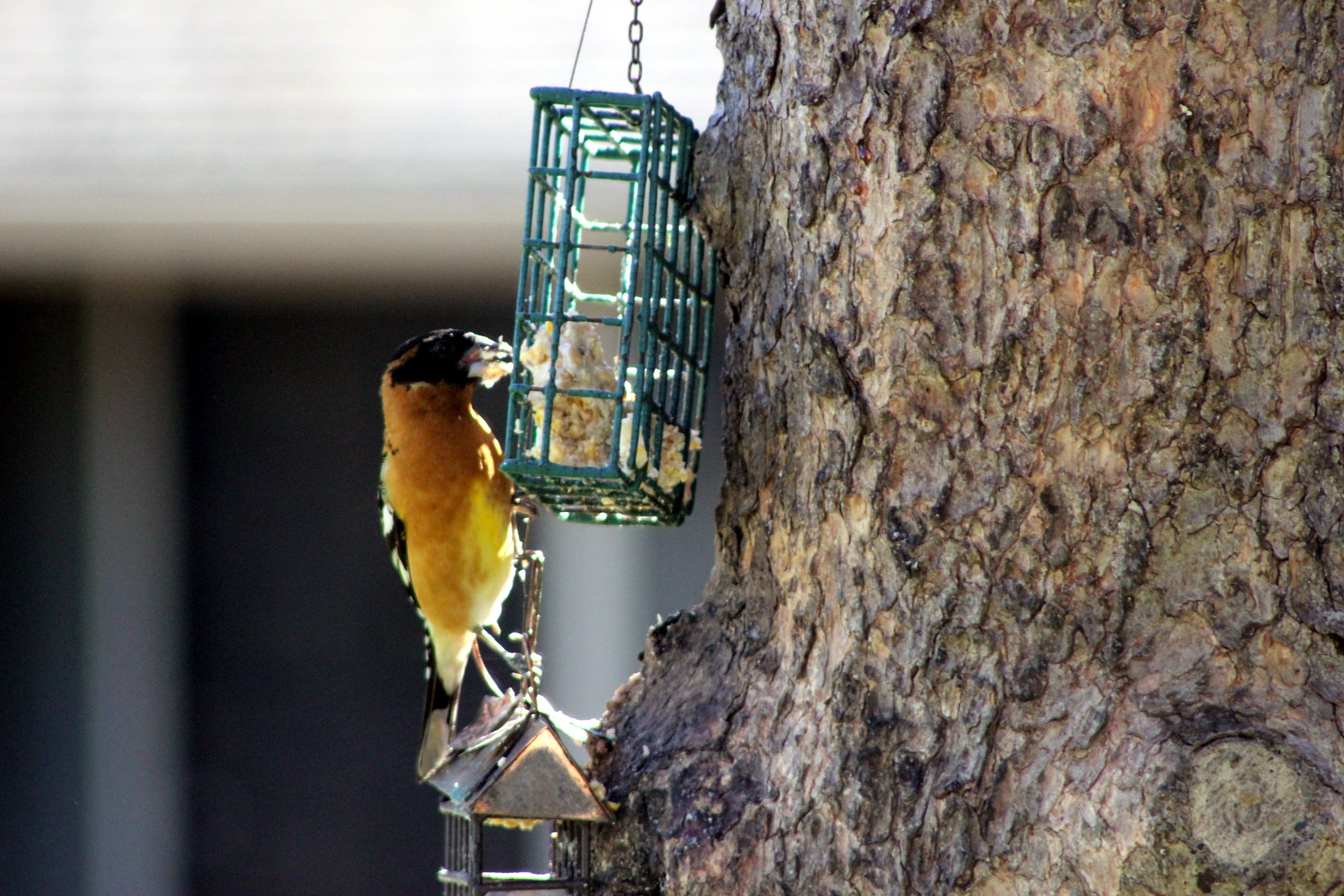This is what greeted me on Saturday morning: a black-headed grosbeak in the suet feeder, with suet stuck to its beak.