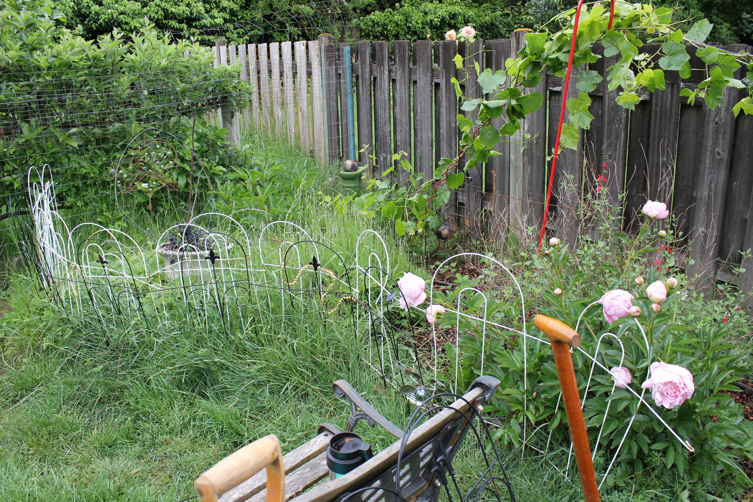 I pulled my bench out of the north flower bed. I really want the bench to go elsewhere (after I have weeded elsewhere). The stupid layers of decorative wire fencing are Anti-Harvey measures: but he still gets through and chews on the fence boards if we aren’t watching him.