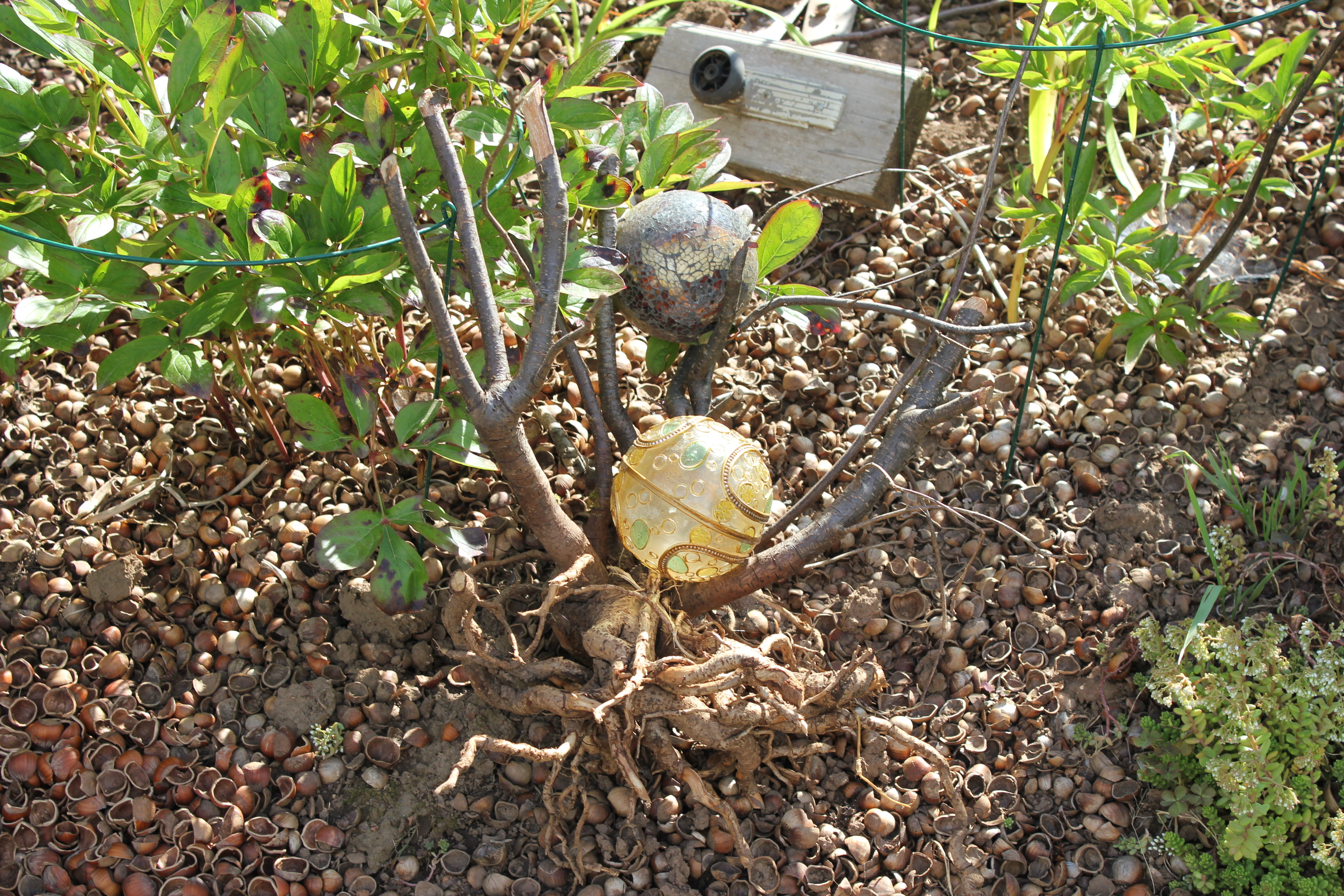 The gazing balls are just cheap plastic ones. I positioned them on the roots of a bush that died in my garden. When I dug it out, I decided I liked the shape of the root ball and rather than toss it away, I am using it for yard art.