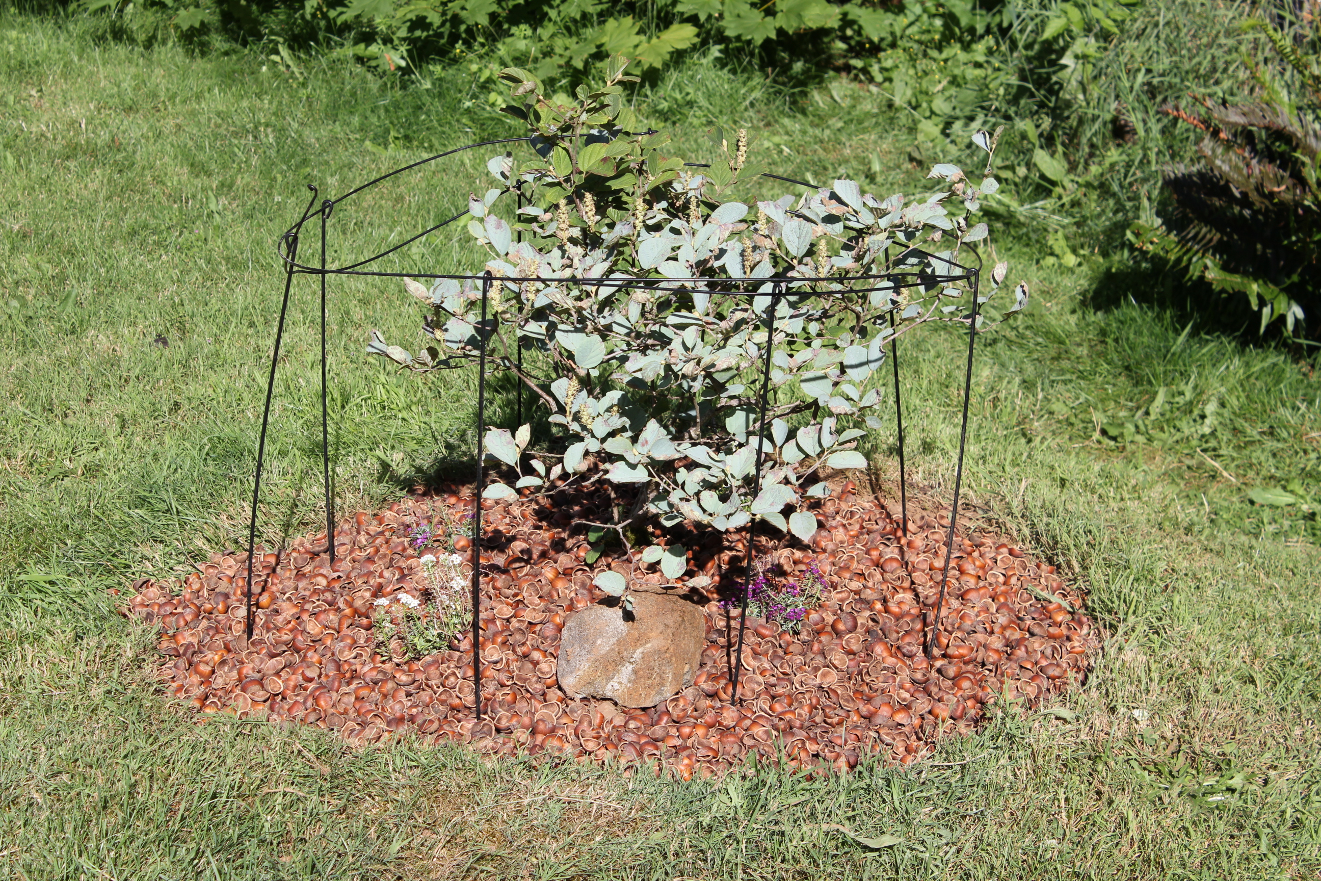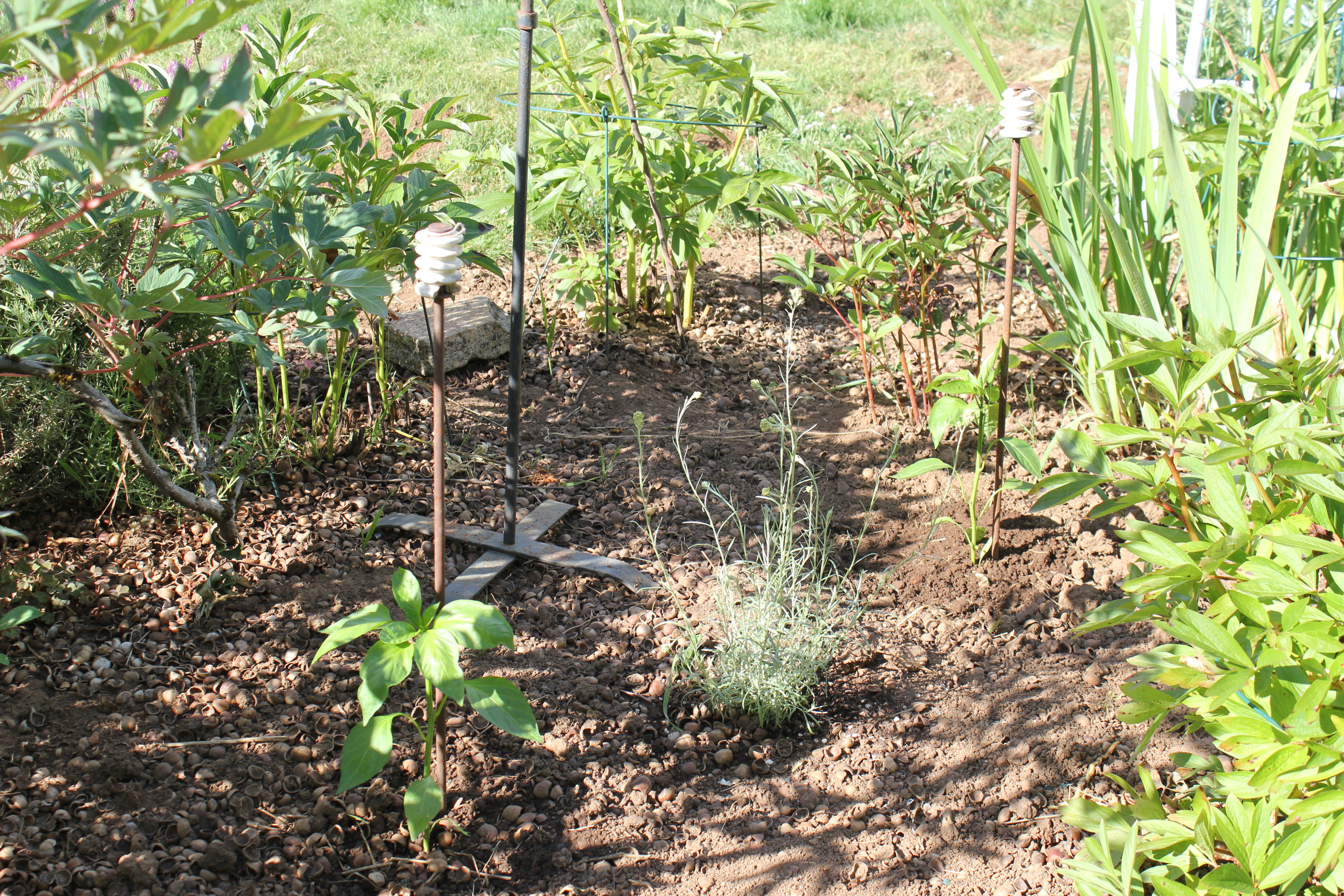 Sometimes I just have to resort to funky with the big dogs. This is my funky “do not pee on this bush” fence. They’ll probably pee on the wires, but they’re still too far away to kill the bush.