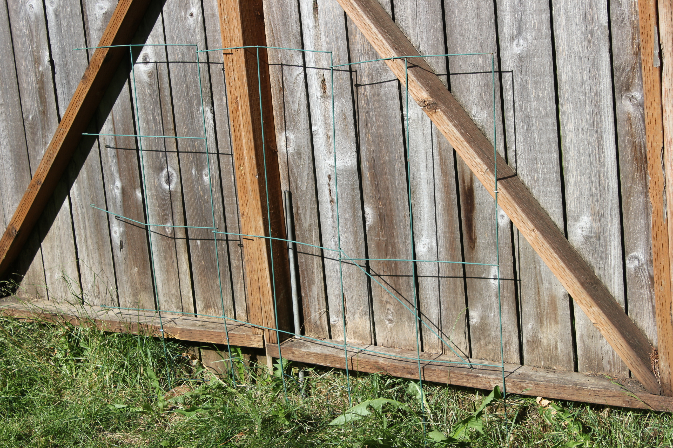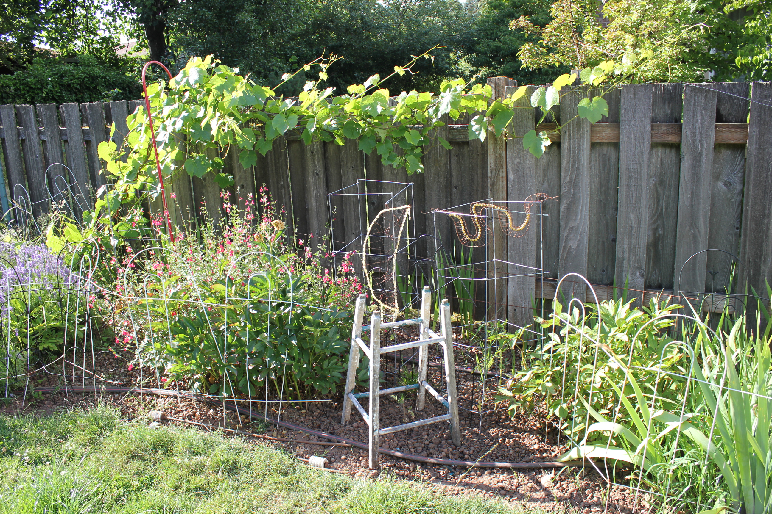 The remains of an old stool become a tomato cage for one of my struggling tomato plants. My wire art hangs from two store-bought tomato cages. And my grapevine is beginning to take over the corner.