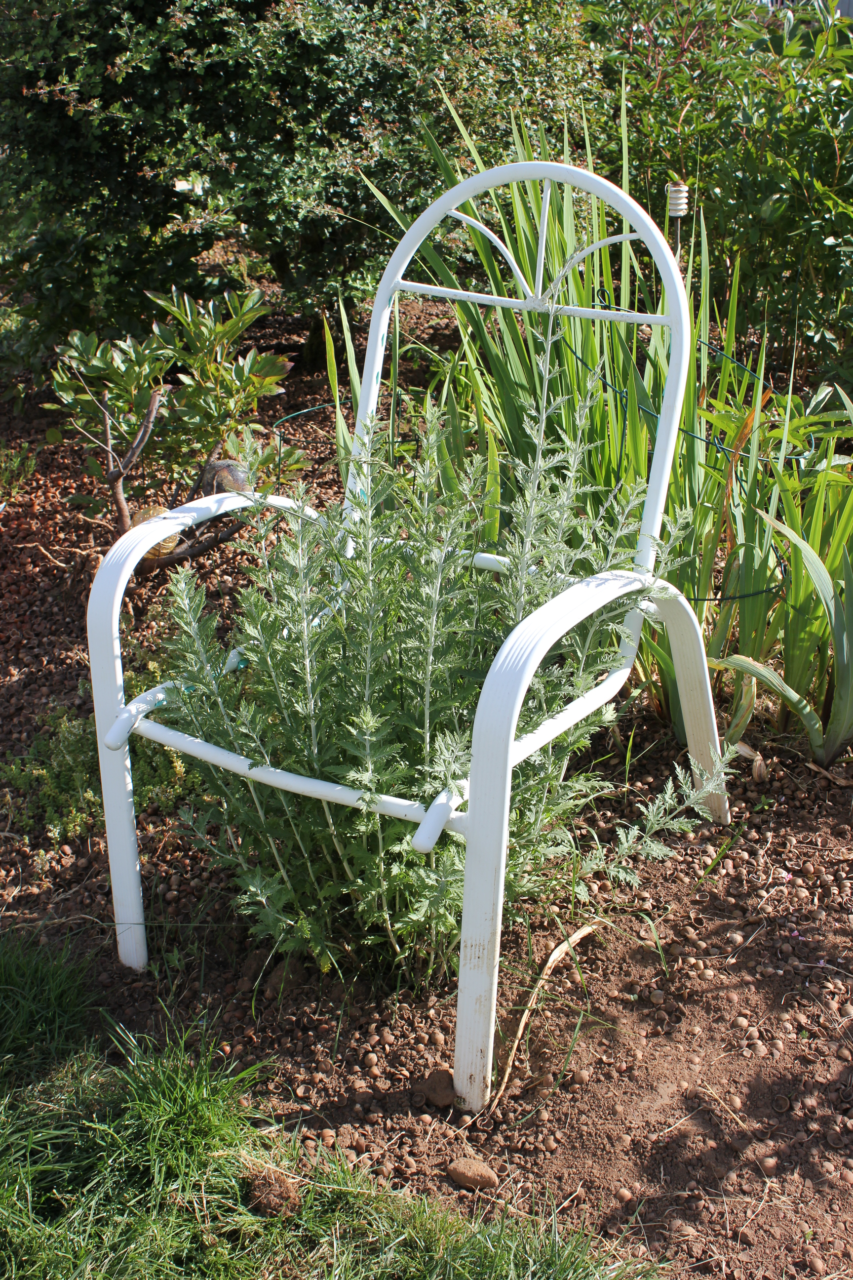 An old lawn chair becomes support for the Russian Sage. By the time the sage blooms, it will be tall and prone to falling over. The chair fits over it perfectly.
