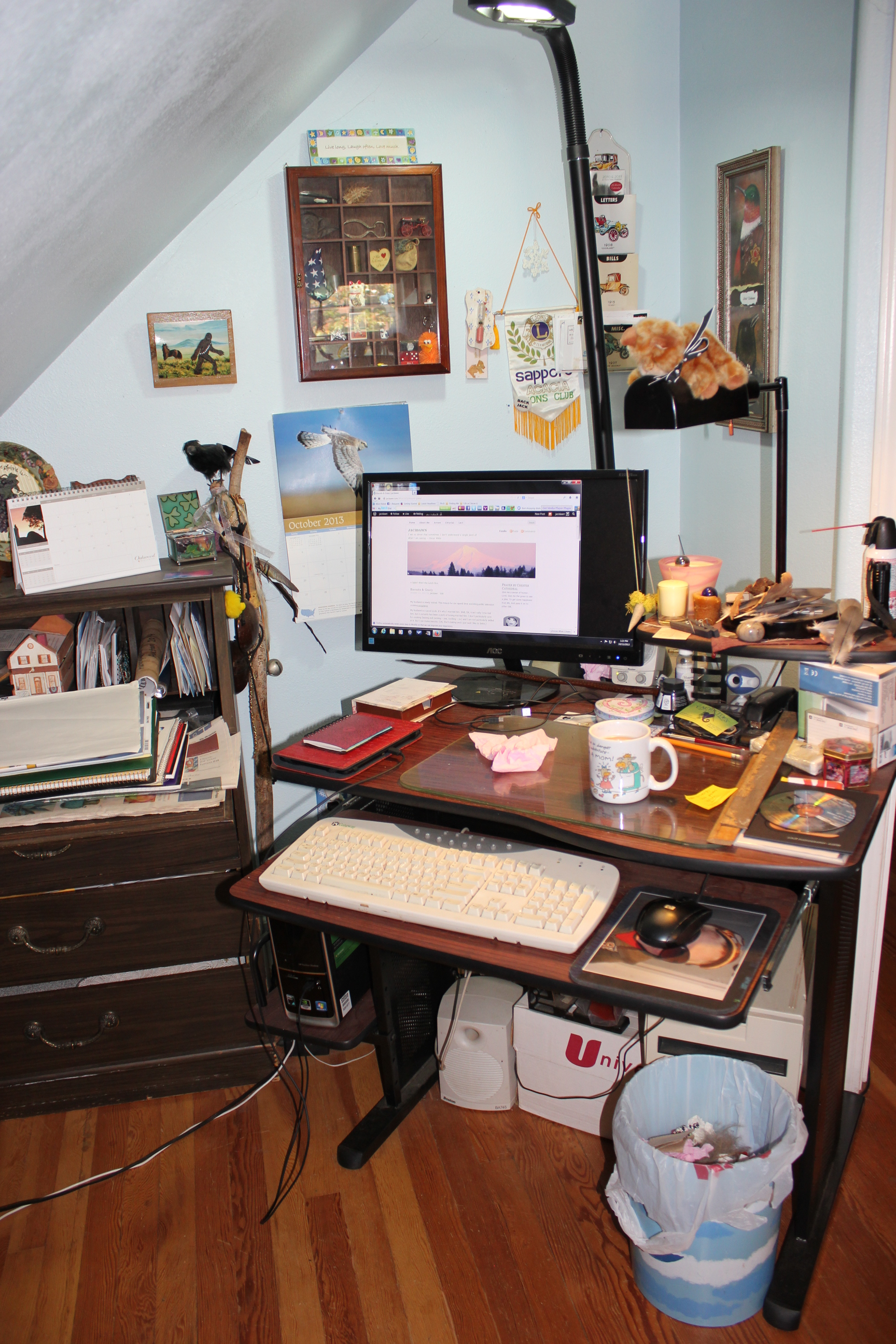 My blogging space is in a corner in the upstairs non-bedroom that I turned into my studio when my last fledgling flew from home.