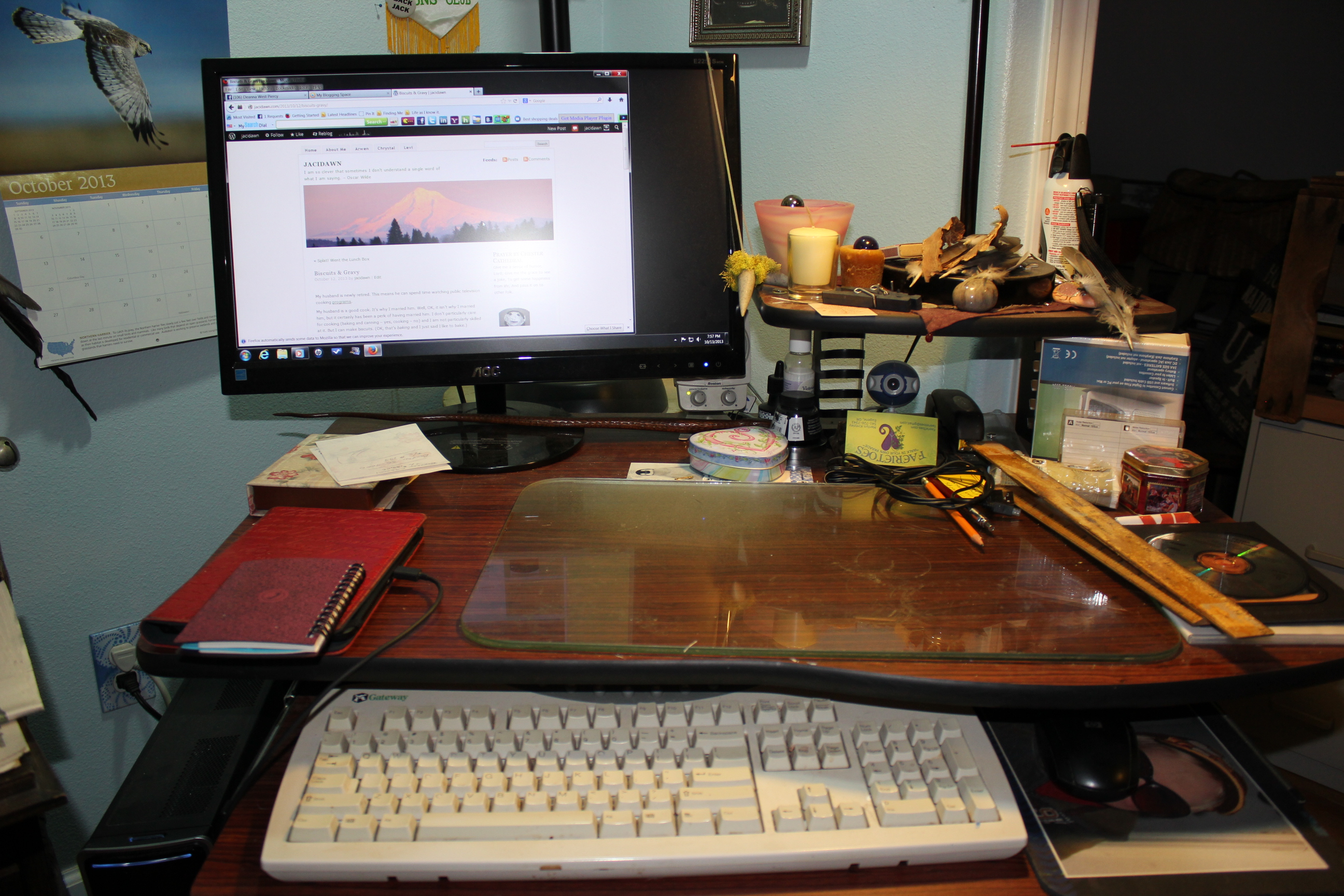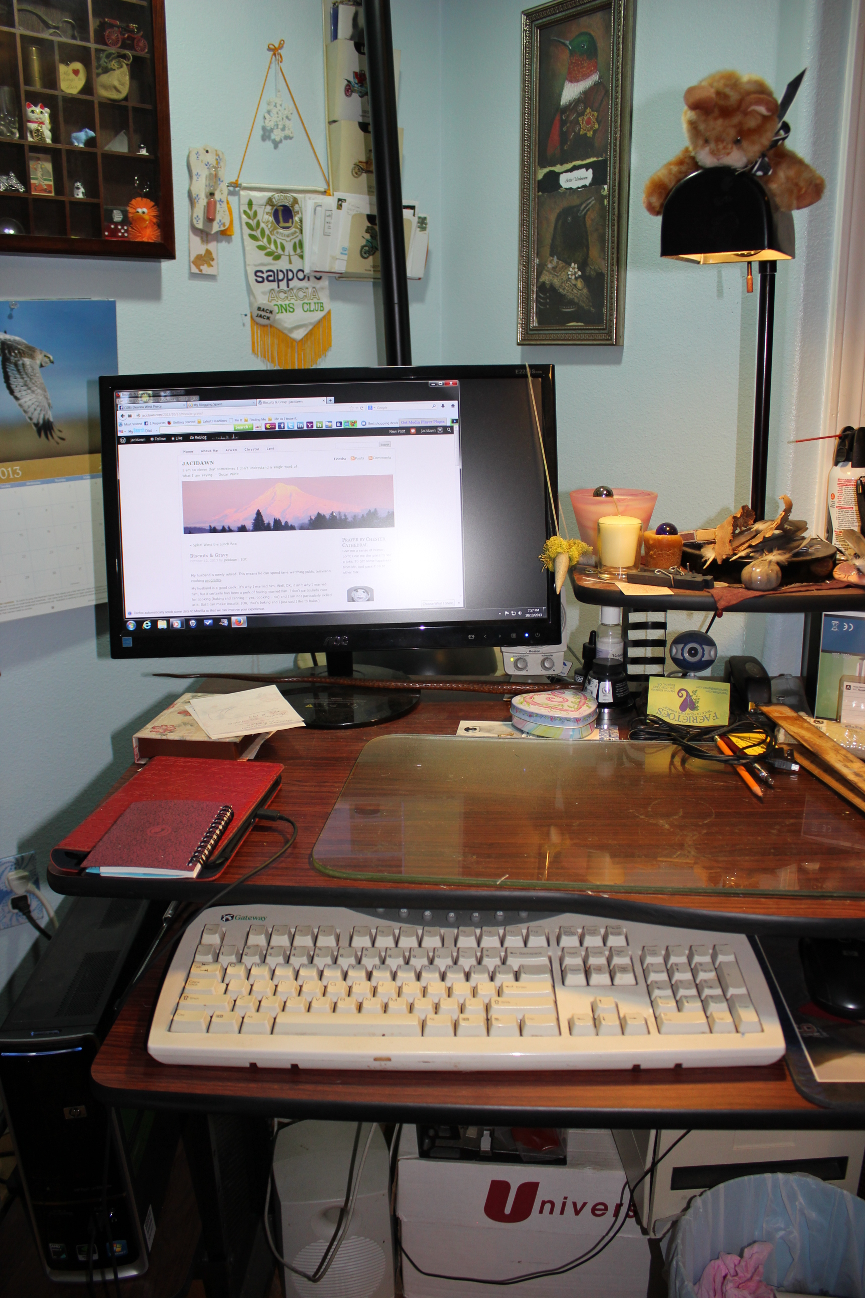 The simple close-up. I have a small collection of band-tailed pigeon feathers floating on the base of the lamp, gifts left in the lawn for me by the pigeons when they raid the feeder. A stone marble. A trio of candles that I rarely light. My faun horns hanging off the side of the monitor. Kindle charging and address book arop that. My notepaper in the decorative box. A pair of 18″ rulers lurking to the side because I also occasionally lay out artwork on my desk.