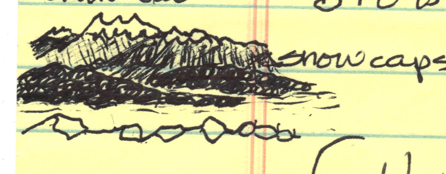 I have a pen in my hand. Snow cap mountains flow out of the ink. Prancing chargers, wild mustangs, howling coyotes. One line to depict the mountains is never enough: you have to shade them in to show the timberline or the snow line.
