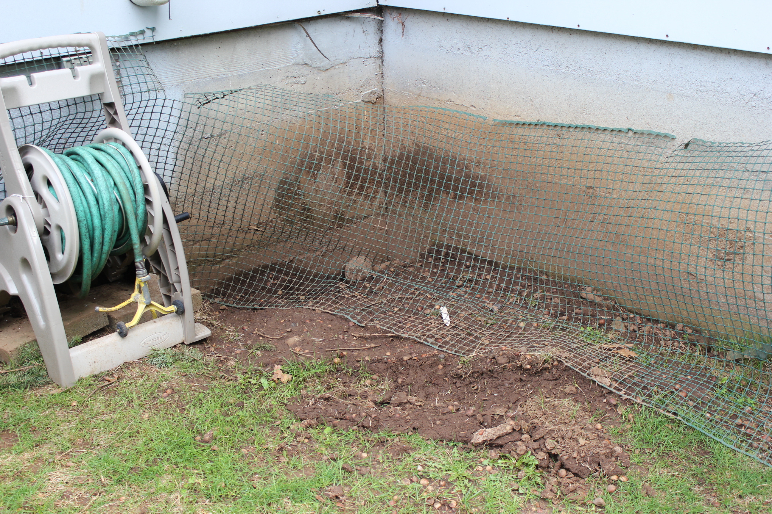 What I did here was put decorative fence up against the wood, pushed it into the ground, and stapled it to the wood. Then I put a second decorative fence in front of it by about 6 inches. Harvey can’t get behind it to even start digging and he can’t get a bite hold of the fence bottom. If you click on the photo, you can see where he’s worked on this section before.