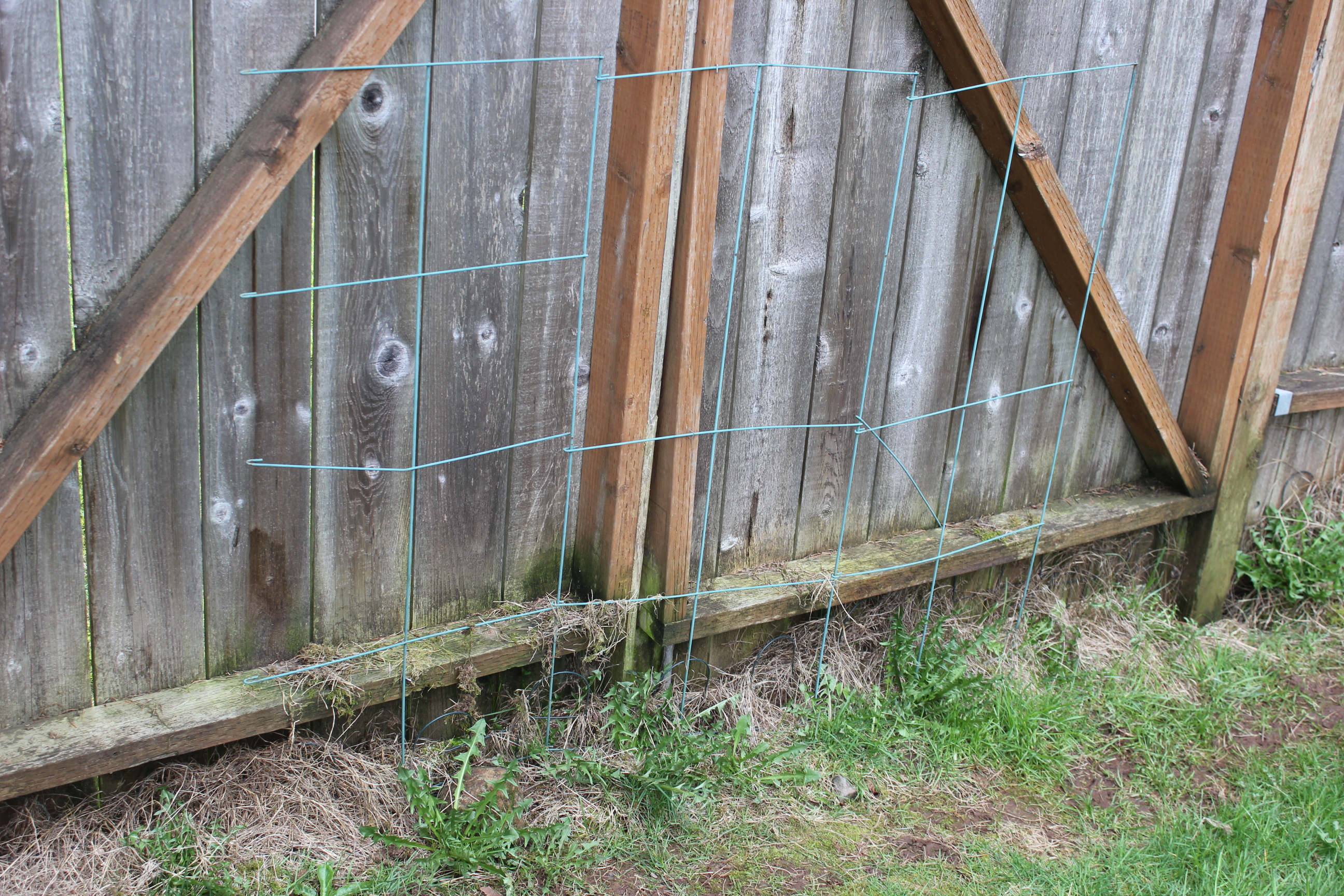 An unfolded tomato cage works on the big gate. He nearly had the gate open when I caught him here – he was just steadily applying pressure on it by poking his head under and pushing.