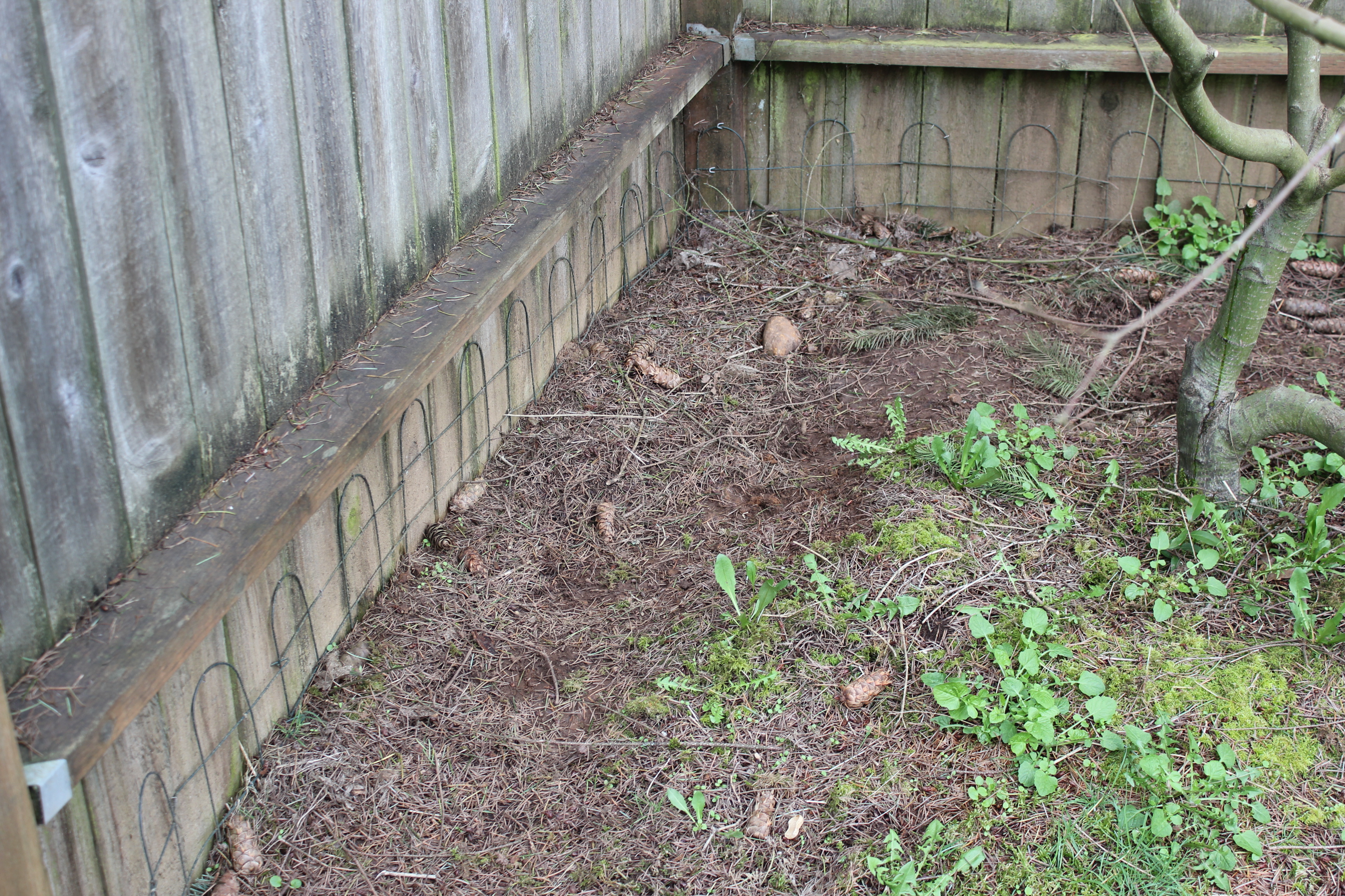 I stopped here. I need to get in behind the grapevine and dog-proof that corner where the espalier and wood fence come together. Harvey has a big hole dug there under the fence and he’s eaten the bottom of the corner boards, so this bit is a little trickier. I think a little chicken wire, buried, in addition to the decorative fence.
