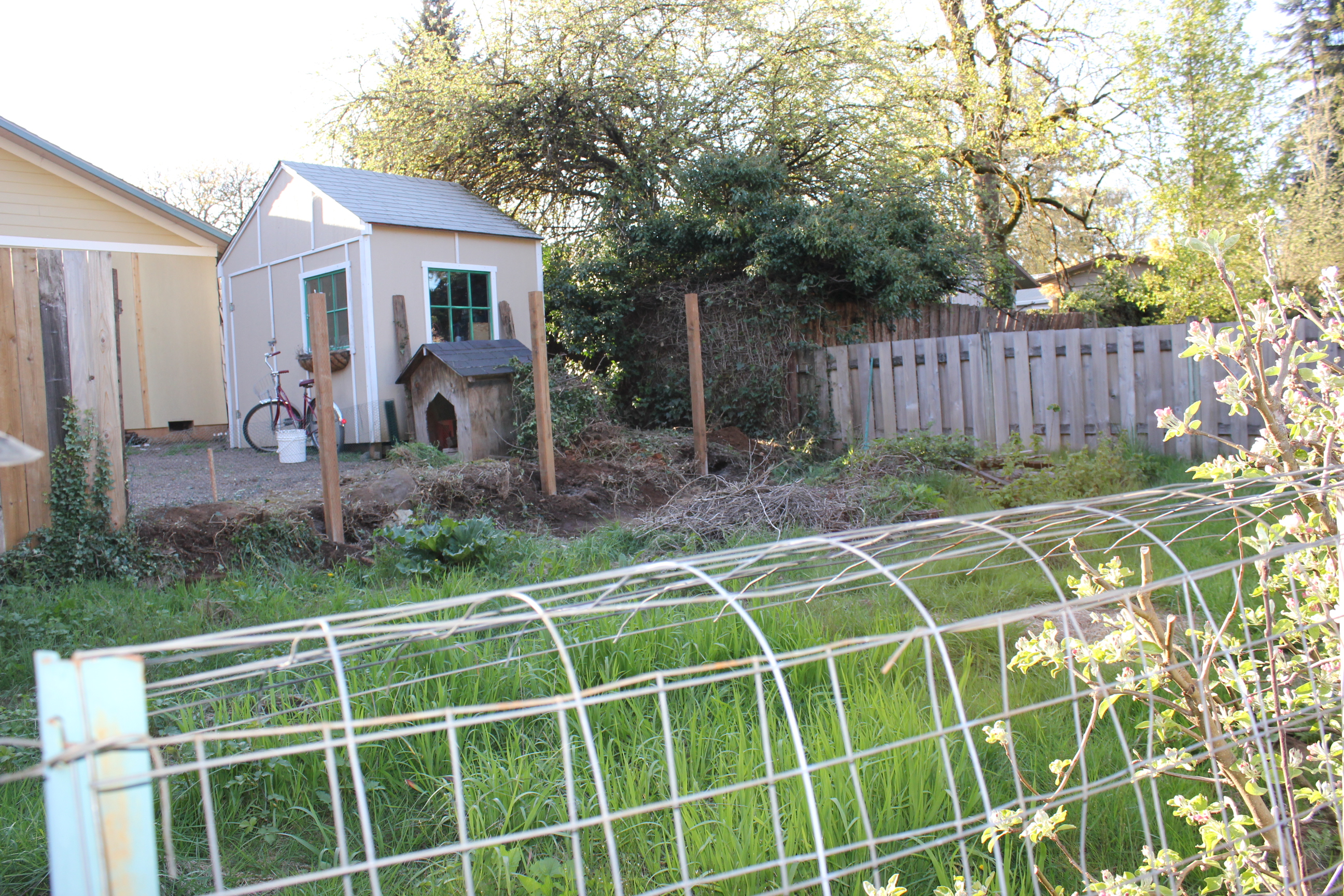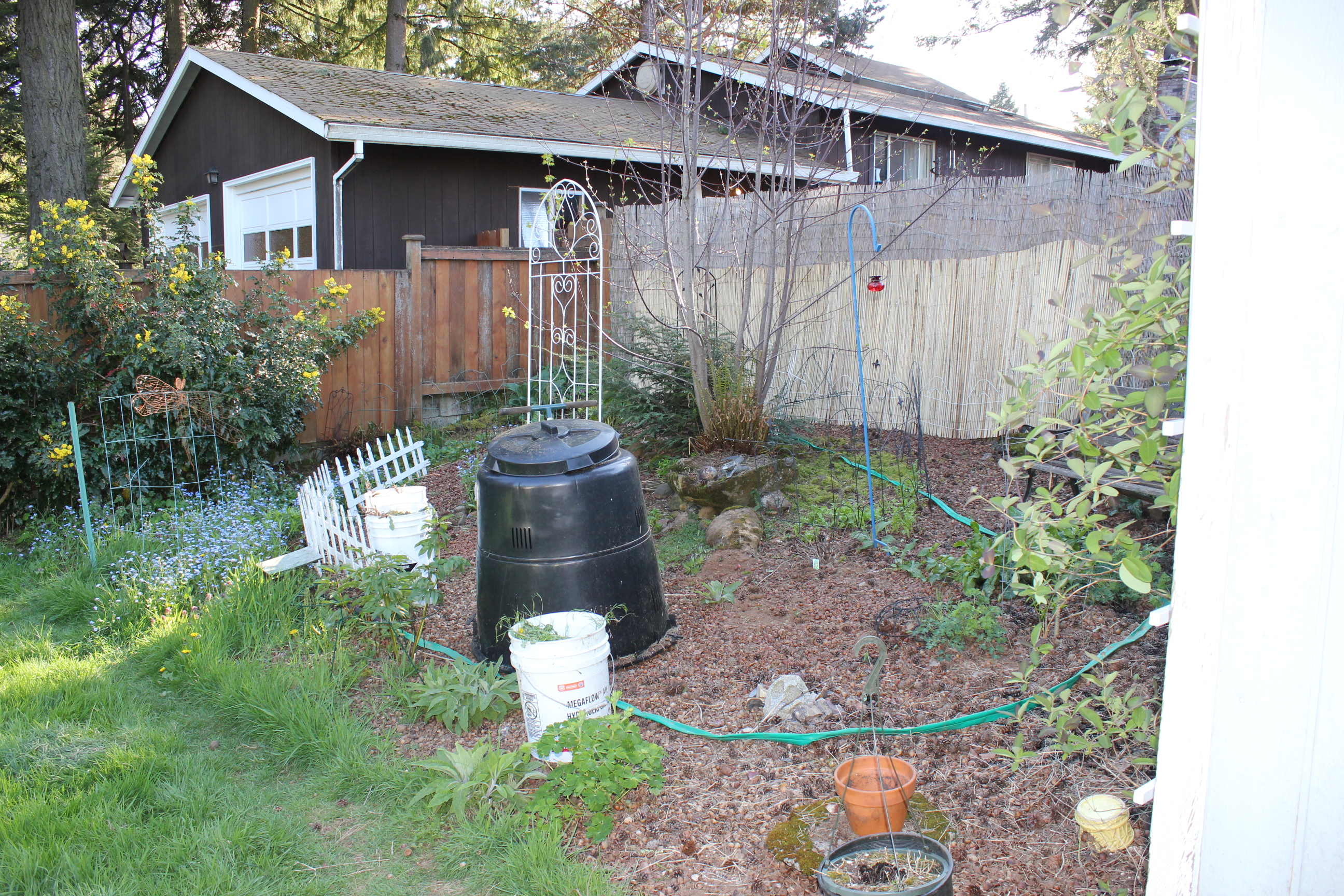 I filled three buckets with yard debris. I tossed fern fronds onto the brush pile on the other side of the shed. I pulled out the compost bin because I think I have a better spot for it, closer to the back door. A sunnier spot that will heat the bin and compost the materials more quickly.