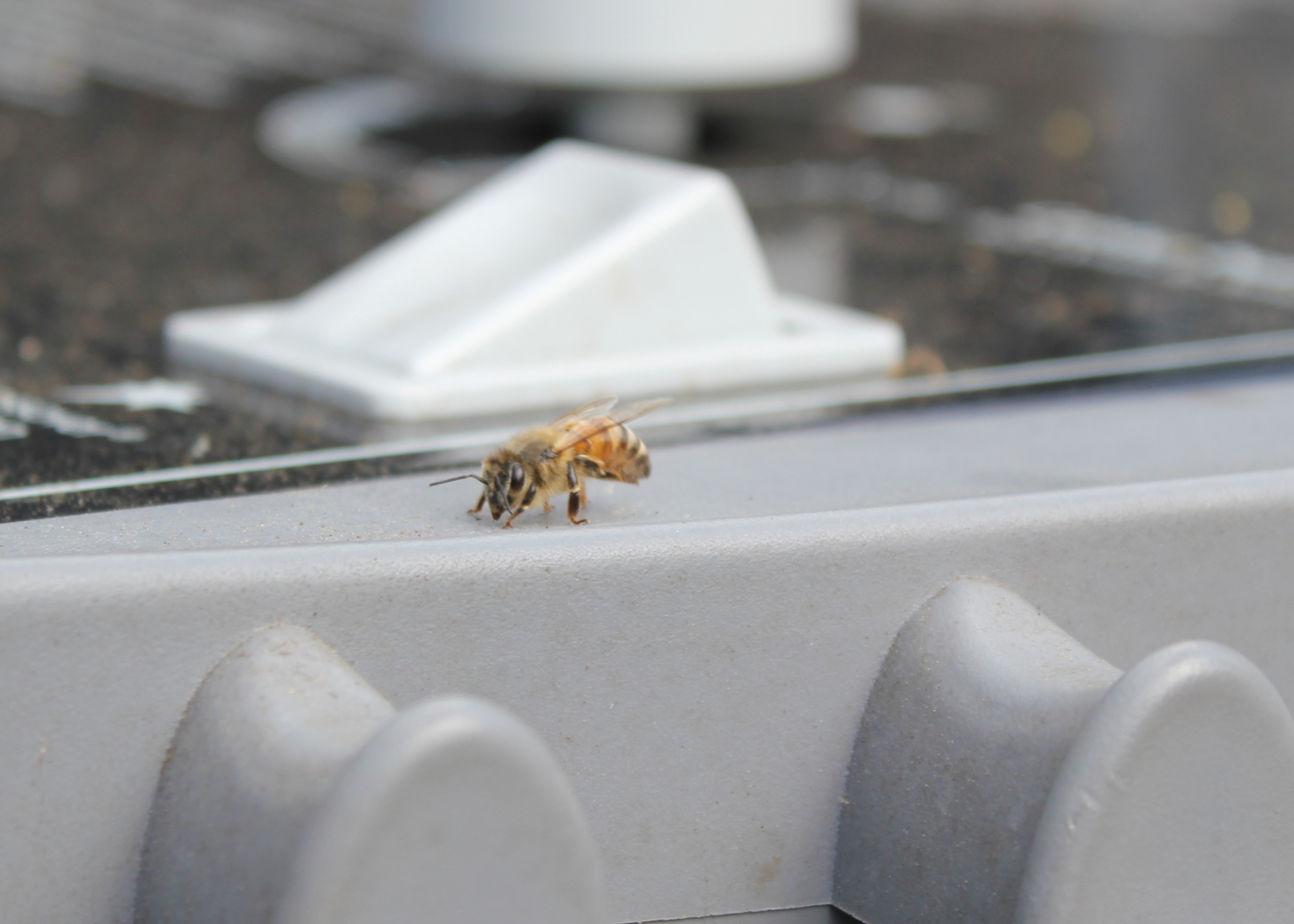 The men had not: one had his back turned and the other just missed it. But both Chrystal and I saw it. It was a slow-motion somersault out of the air. The bee landed on the barbecue and seemed dazed, slow, and subdued. It stayed there several minutes, cleaning itself from top to bottom.