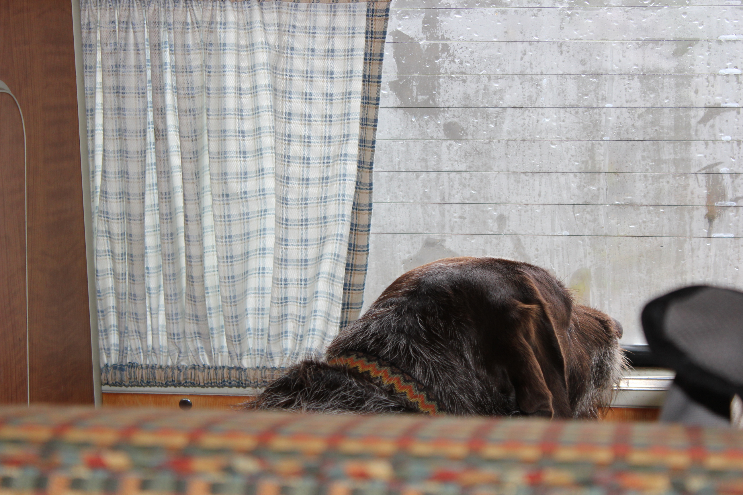 Somehow, we made it to 8AM. I think I slept a total of six hours. The rain was done, a cool breeze was blowing, and we put the dogs out. I changed my clothes: my flannel pajama bottoms tucked into my socks, with my jeans pulled up over them. My tee-shirt under my long-sleeved shirt, under my denim vest, under my Carhart™ coat. I tucked my dirty hair up under my ball cap. Harvey curled up on the gravel and shivered.