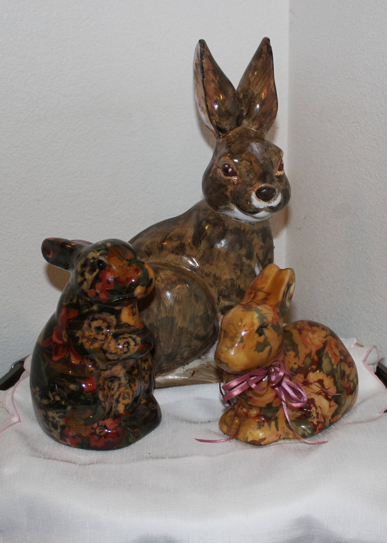 I painted the big bunny. The other two bunnies were purchased at the same Goodwill store, but the one on the left was purchased one year and the one on the right was purchased a year later. They are serendipitous twins on a holiday that has nothing to do with rabbits or hares.