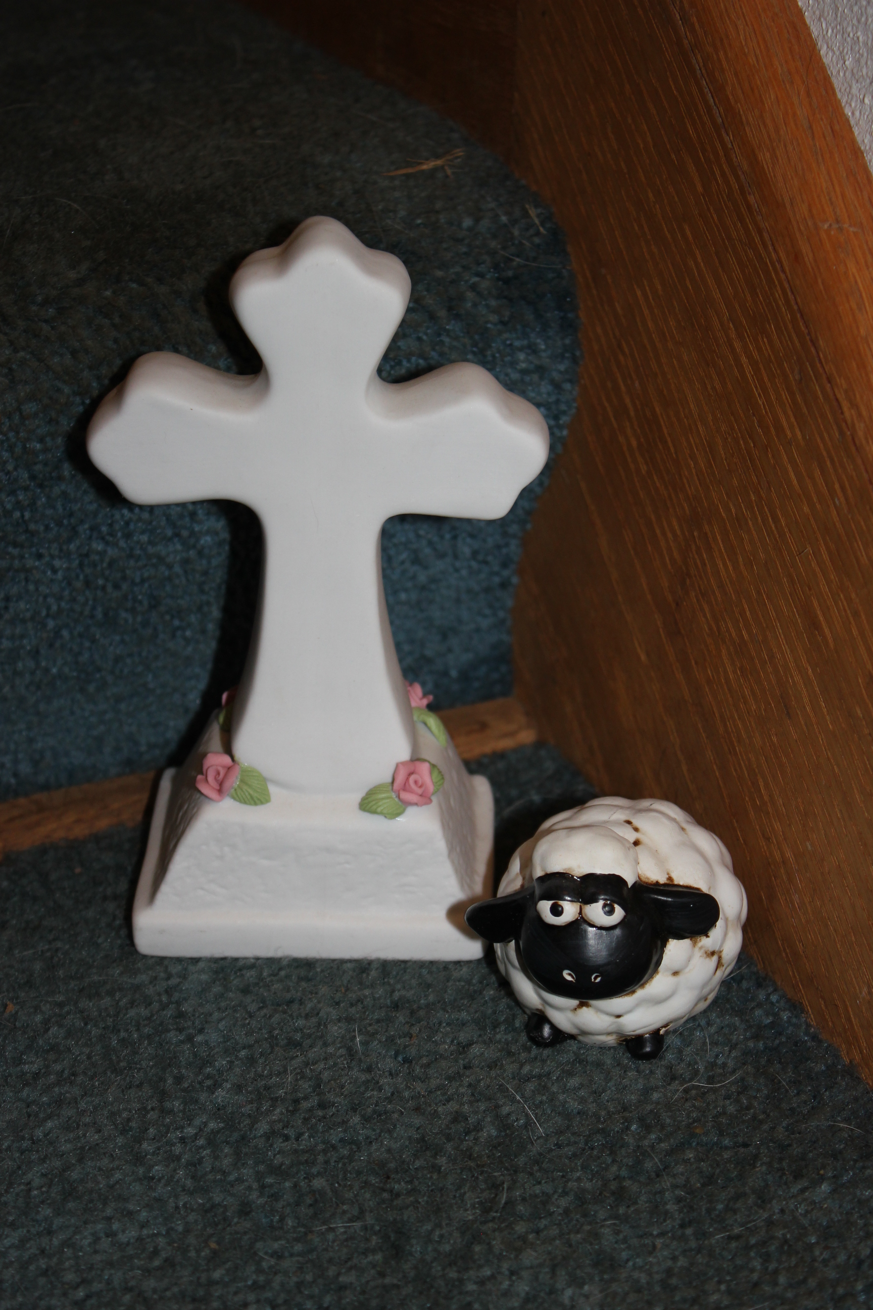 Please don’t look at that filthy blue carpet. The cross is the ONLY cross I have ever come across for sale during Easter. I actually purchased it new from a local K-Mart. Funny how a holiday that is about Christ is not represented by the empty cross anywhere.
