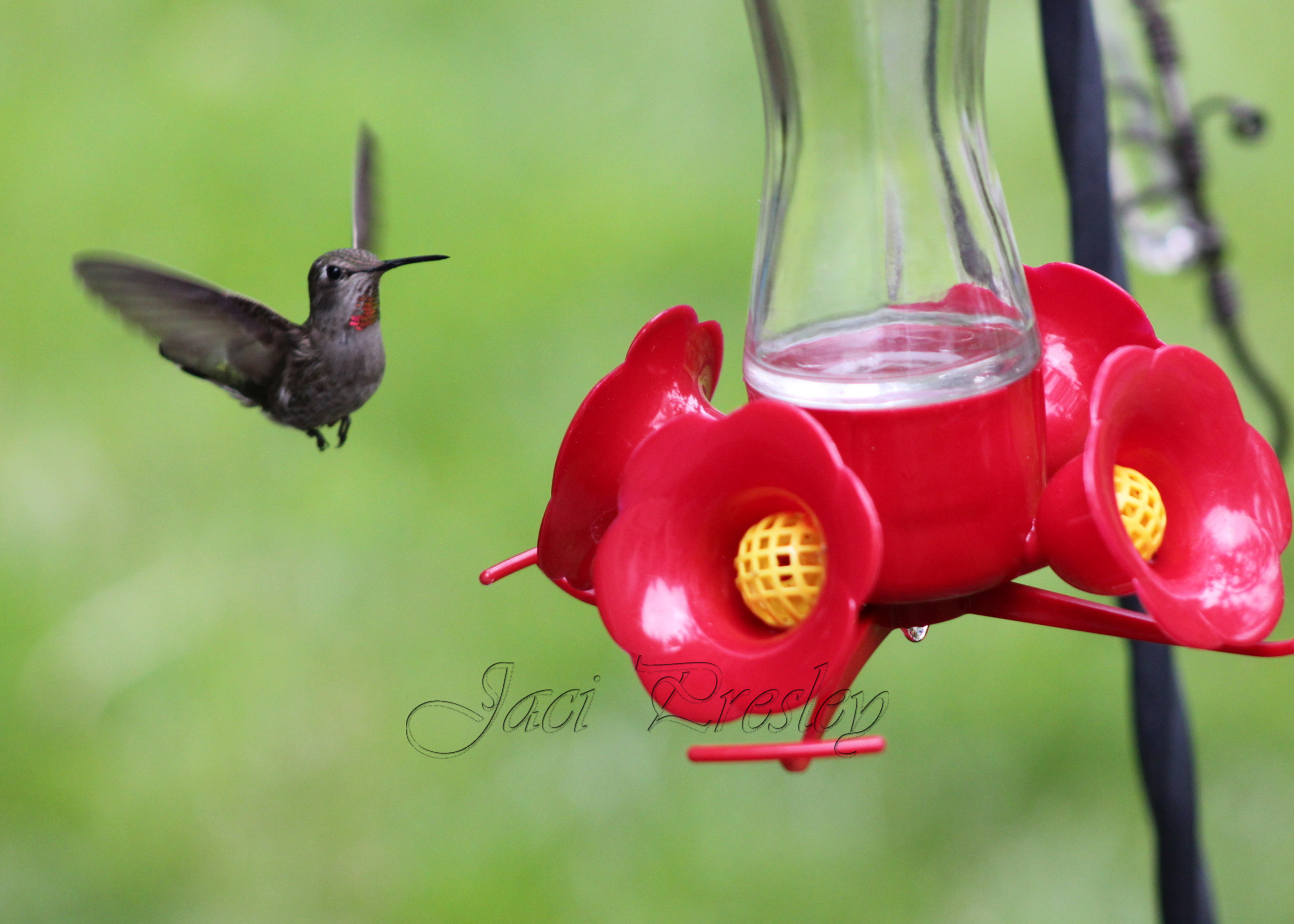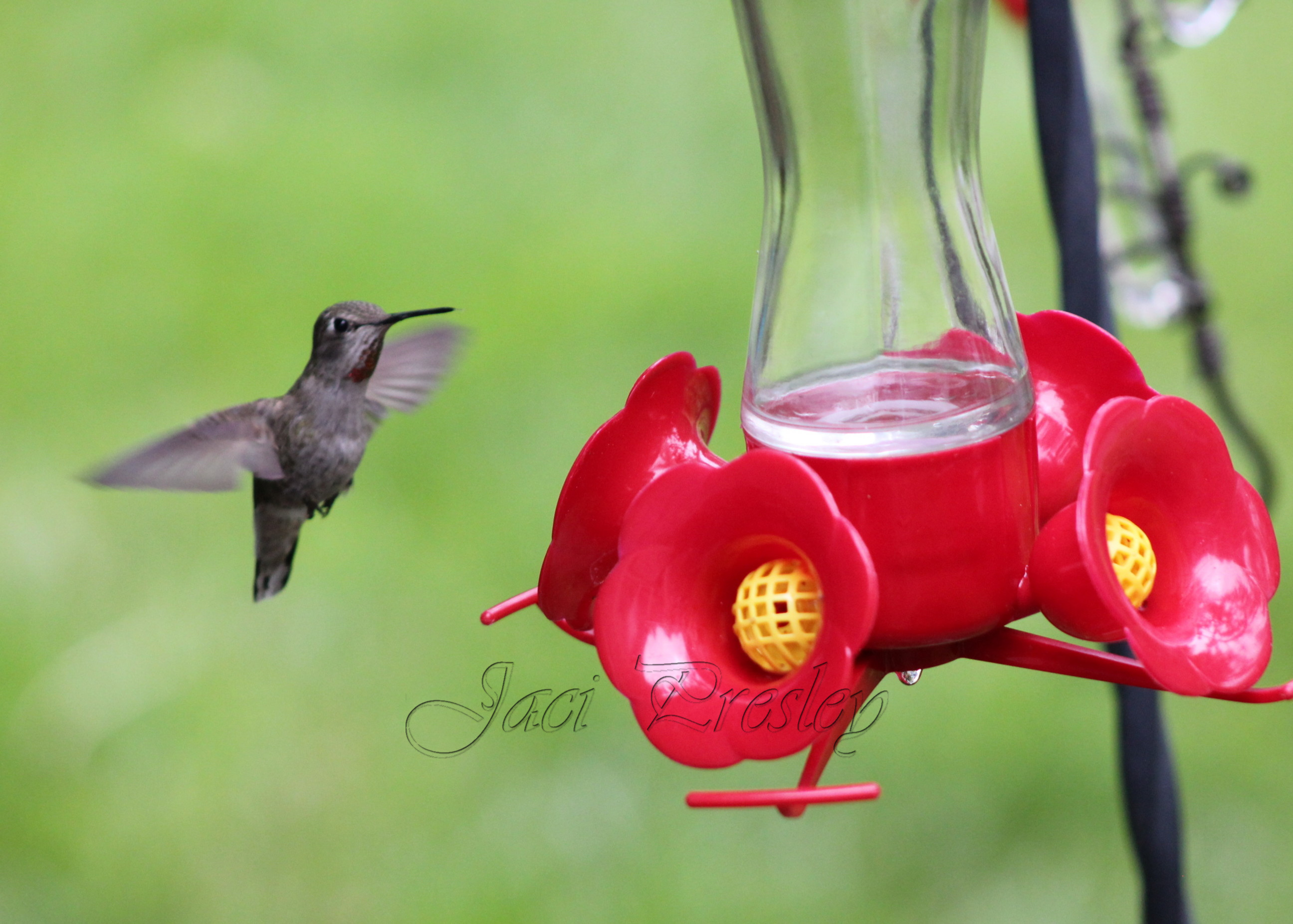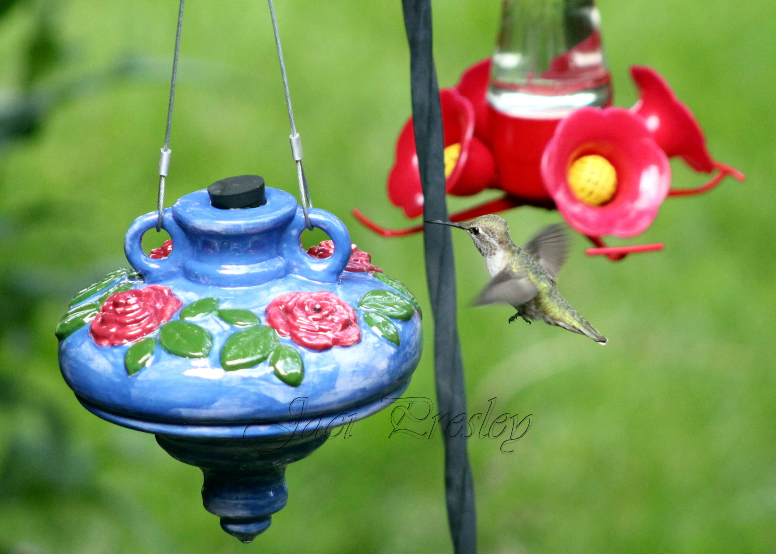 Different female hummer. Anna’s hummingbird. I love this funky ceramic feeder I found at Goodwill – and so do the birds.