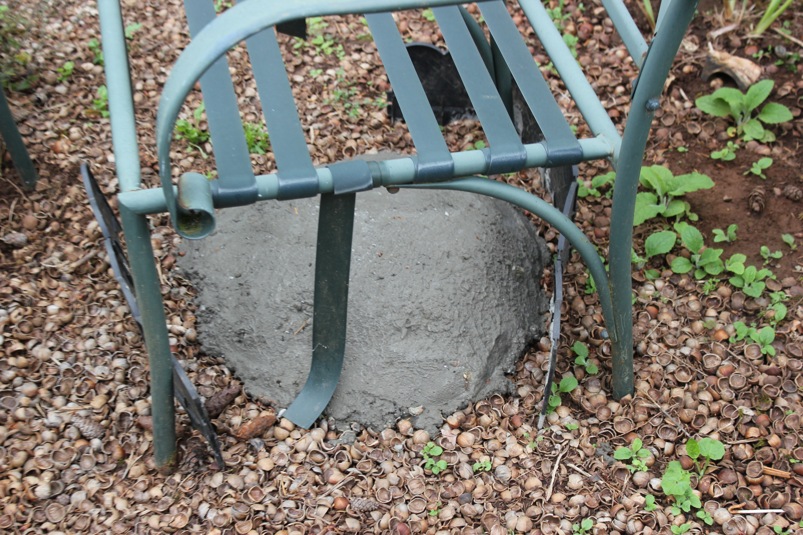 I put an old lawn chair over the wet mound to keep the dogs away from it. The stuff my husband used is a quick-set stuff you can buy at a hardware store for less than $5. It fills a 5-gallon bucket. He added enough water to mix it thoroughly and used half of it to set a post in the ground. The rest was my bonus.