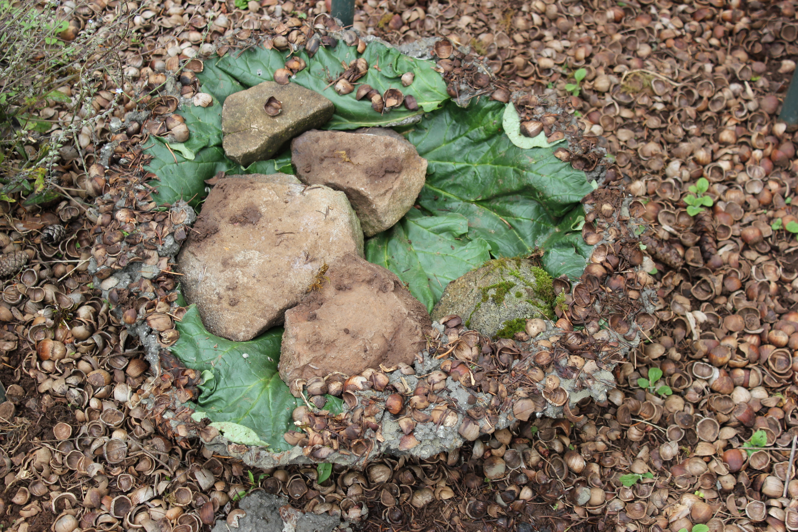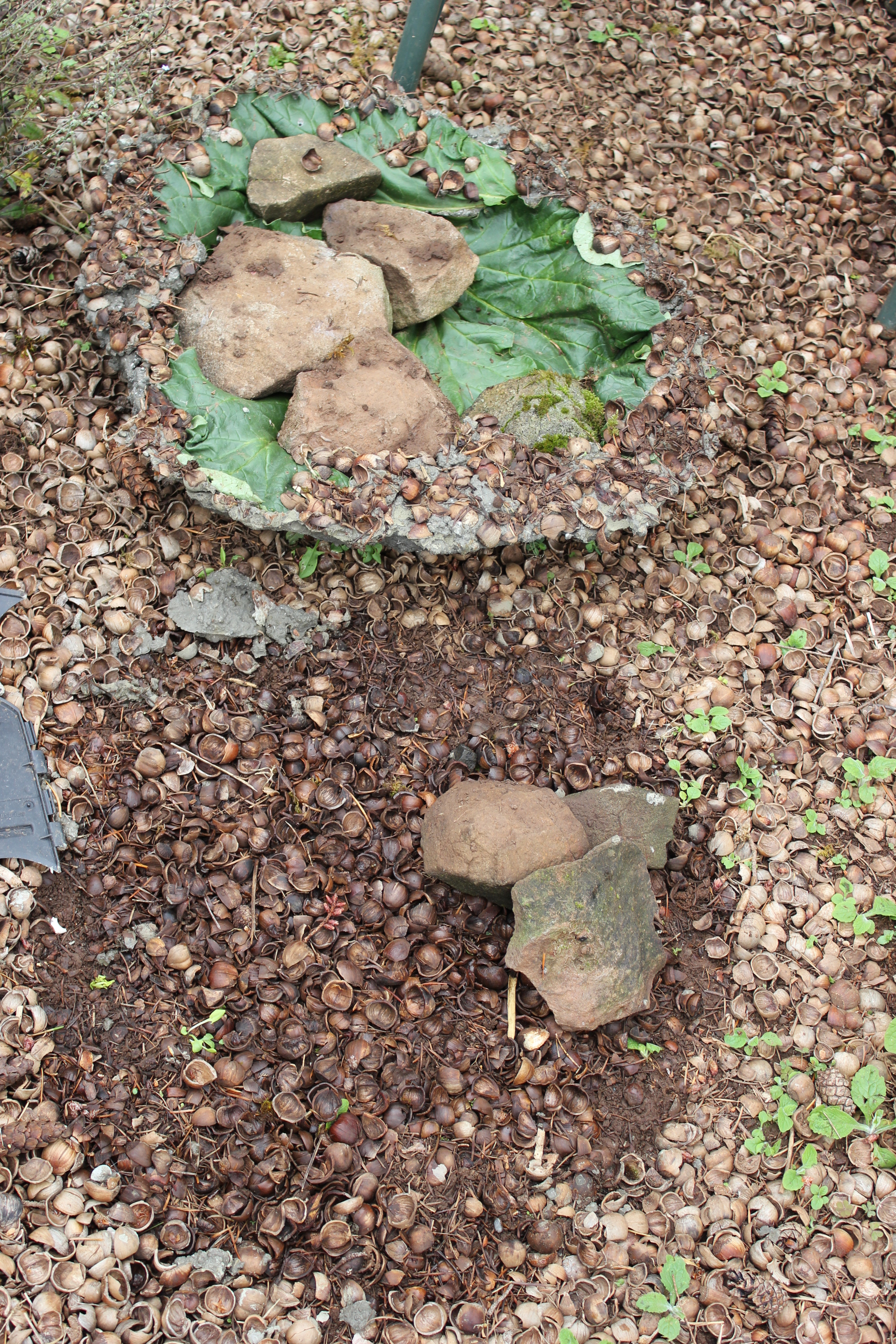 Grab a bunch of roundish-rocks, a handful of rhubarb leaves, and haul the 5-pound bucket over to a bare spot in the yard. Pile the rocks in the center so they form sort of an inverse bowl shape (no need to be perfect) and place the rhubarb leaves (face down) on top of them, covering the rocks as well as you can. The shovel as much of the wet mix onto the leaves, patting the surface with the back of the shovel. (Wear gloves – I had some on when he handed me the bucket.)