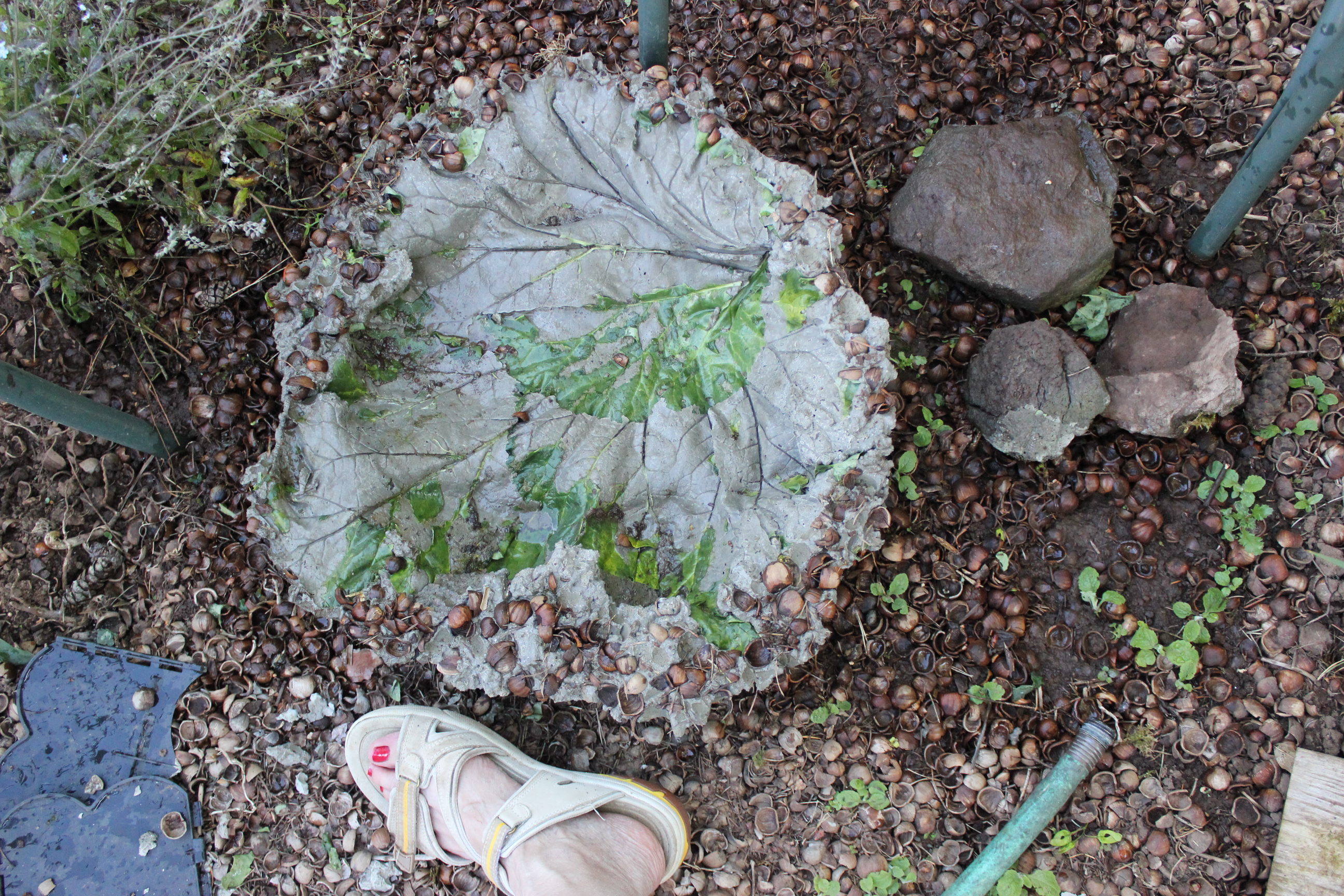 I stuck my foot into the photo for size comparison. It’s a nice-sized bowl. I got as much of the rhubarb peeled out as I could, but Nature will have to take her course with what is left. I’ll pick at the hazelnut shells, but some of them are probably embedded for the life of the bird bath (or whatever I decide to use the bowl for).