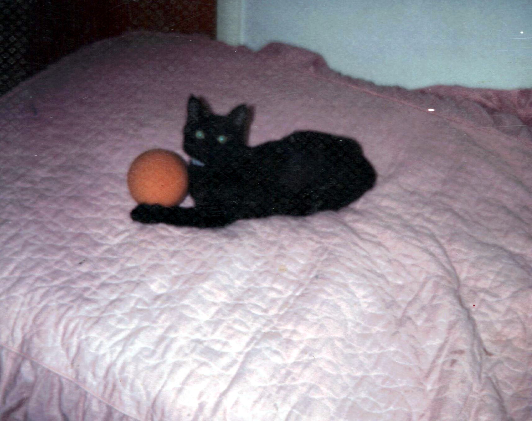 A few months later, a little black kitten wandered in to our lives. My brother coerced Mom to let him stay in the garage until Terry had built up his nerve to broach the subject with dad. Dad noticed that Mom wasn’t parking in the garage, however, and the subject came up after only three days of hiding. Dad knew he’d been had, but it didn’t make him happy. Speckos was allowed, BUT NO MORE CATS DAMMIT.