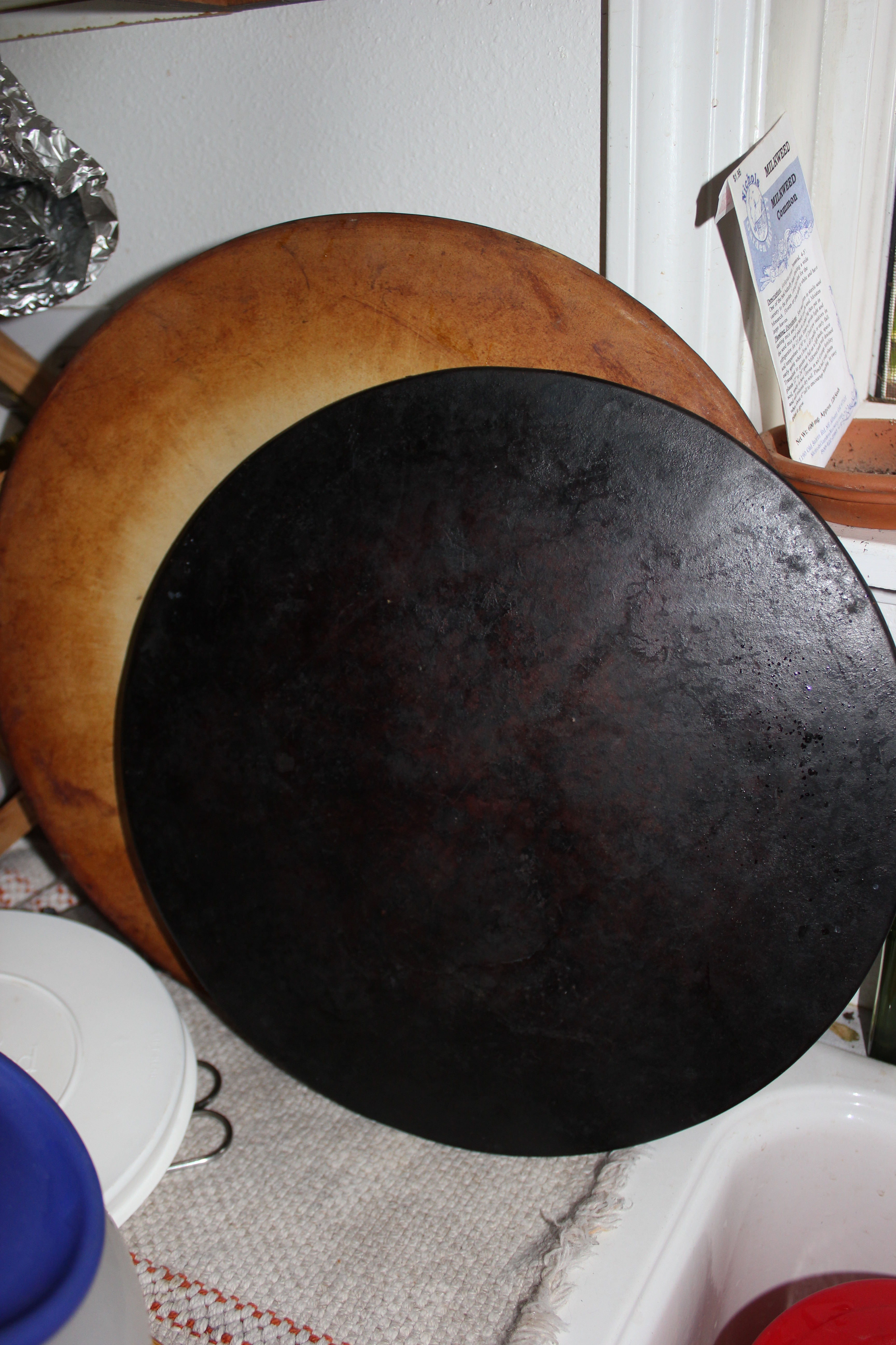 The black one in the foreground is my well-used Pampered Chef stone, slightly smaller than the one I bought for two bucks today. It’s supposed to be black after so many uses – that’s the natural seasoning of a fine baking stone, much like the fine seasoning of a good set of cast iron pans.