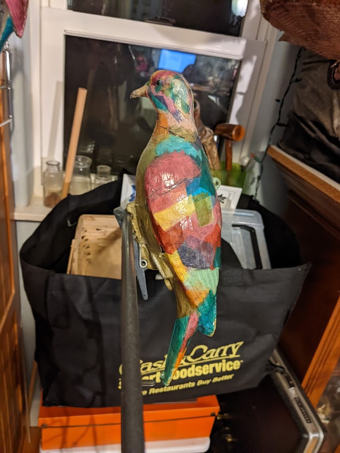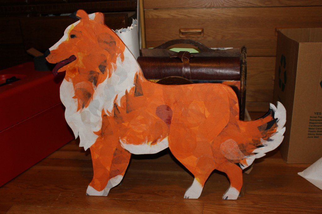 I picked up this poor wooden dog at a yard sale. His restoration story was published here. I “painted” him with tissue paper and liquid starch. A coat of polyurethane topped him. He’s just been gathering dust while I decide what to do with him.