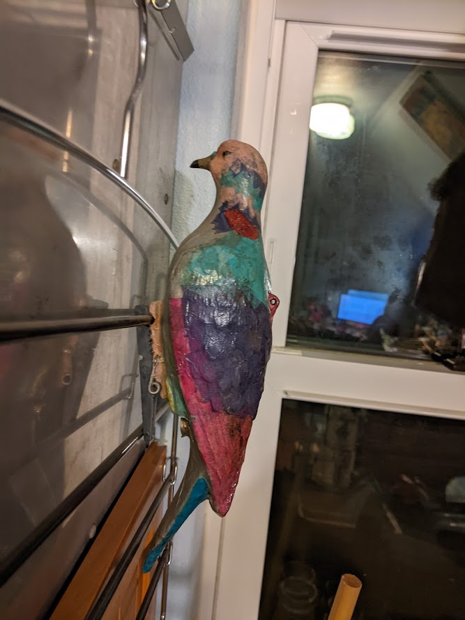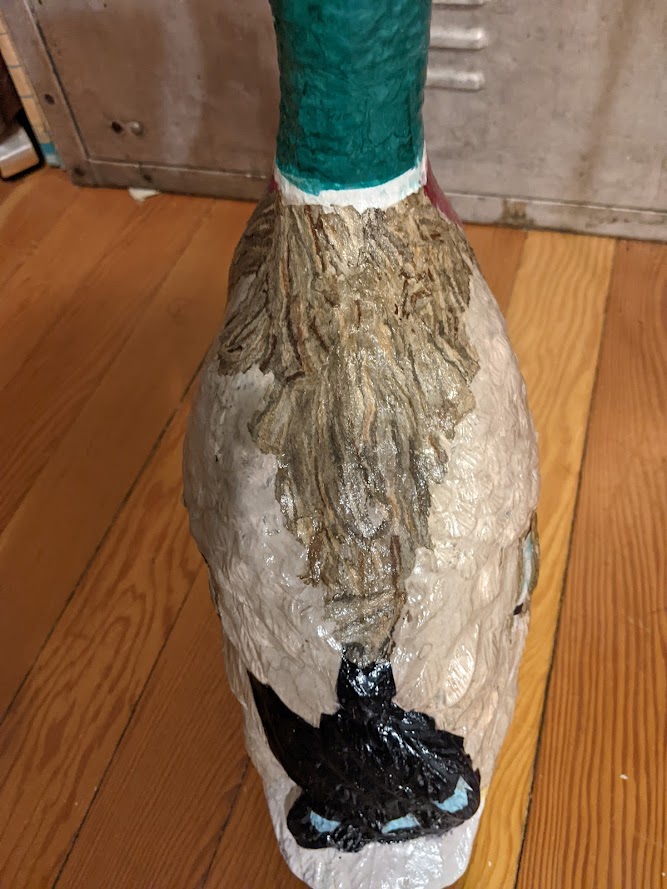 The back “feathers” are not done with tissue paper, but with the remains of a bald-faced hornet’s nest I found on a hike. I finished him with a simple coating of interior varnish purchased at the craft store.