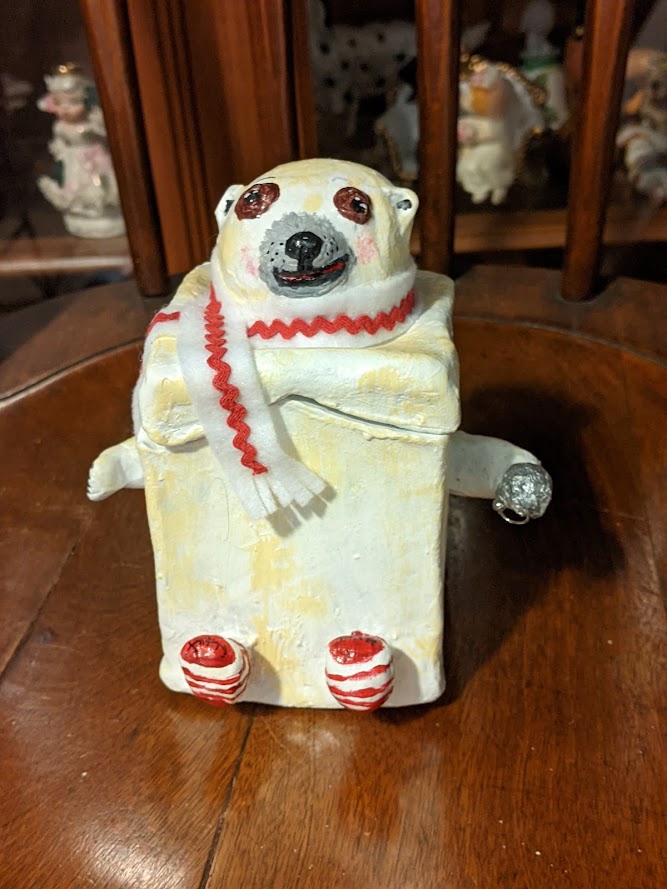 I took apart a “fish hook” earring hook, snipped it to size, and hot-glues it into position for the hook. Aluminum foil glued down tight and a double coat of silver paint finished off the “hook” effect. Now paw, no problem. I now have a polar bear with a hook for a paw. I left the inside unfinished. I figure it will be a boy’s “treasure” box for found items like feathers, rocks, screws, nails, and robin’s egg shells. I might have a grandchild in mind as well.